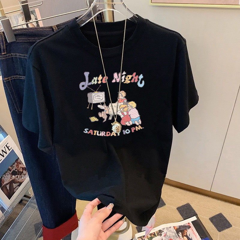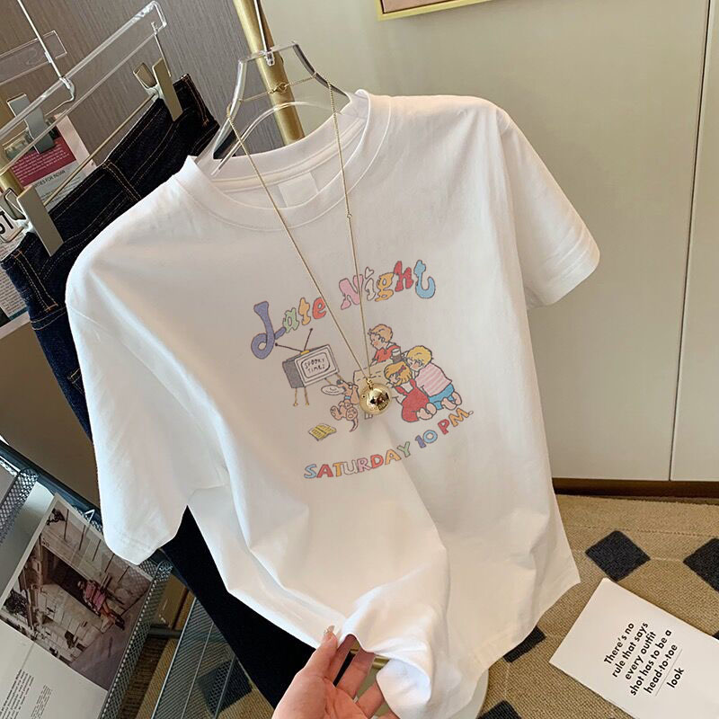2025夏季新款正肩粉色纯棉短袖t恤女卡通印花宽松百搭减龄上衣潮