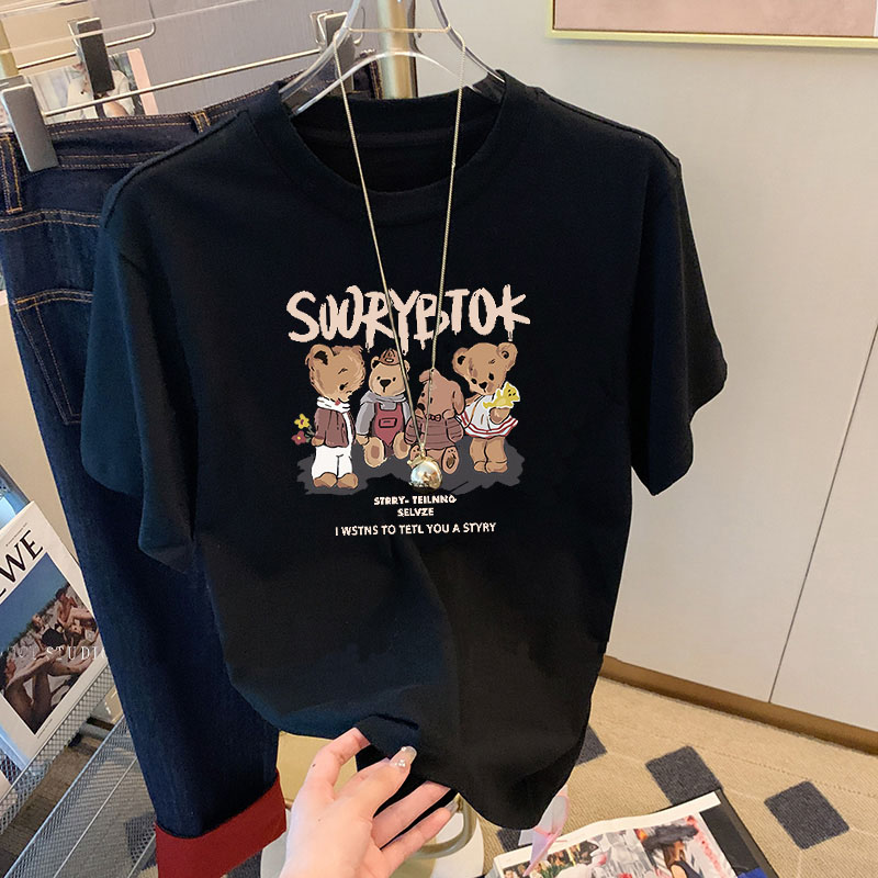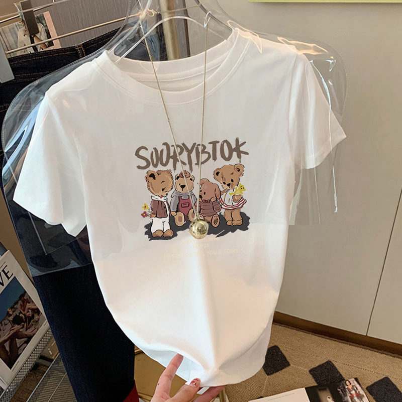 灰色小熊印花纯棉正肩短袖t恤女夏季2025新款设计感小众宽松上衣
