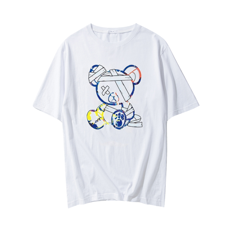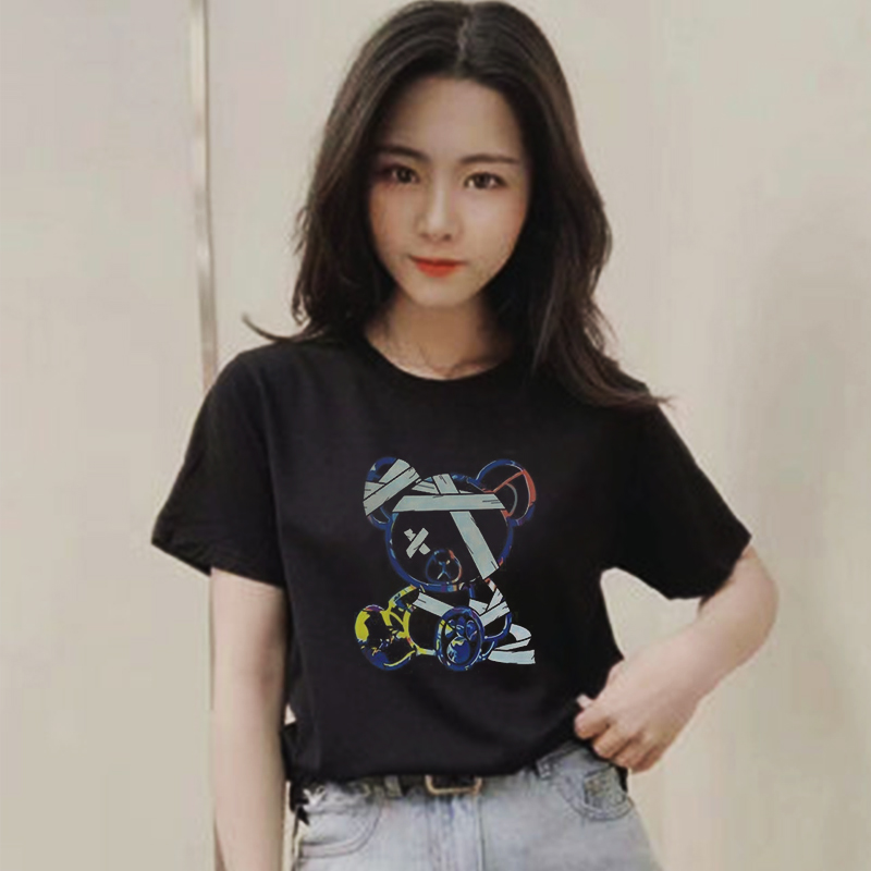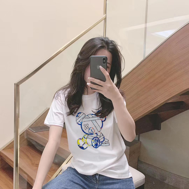 夏季白色纯棉短袖t恤女宽松2025新款卡通印花小熊纯色透气圆领潮