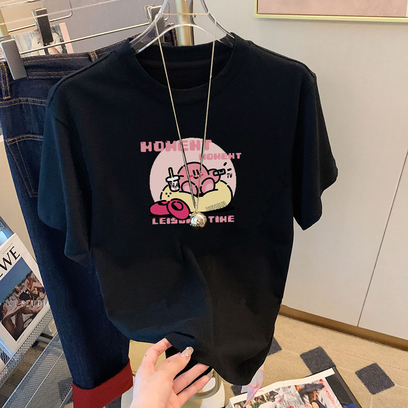 夏季新款设计感宽松纯棉粉色短袖t恤女卡通图案正肩百搭上衣