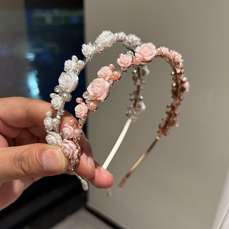 新款甜美小清新轻奢仿珍珠数水钻玫瑰花发箍女生时尚百搭头箍发饰