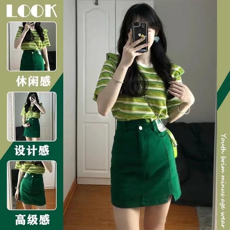 夏季新款小个子俏皮女装活泼套装时尚条纹圆领T恤短裙两件套