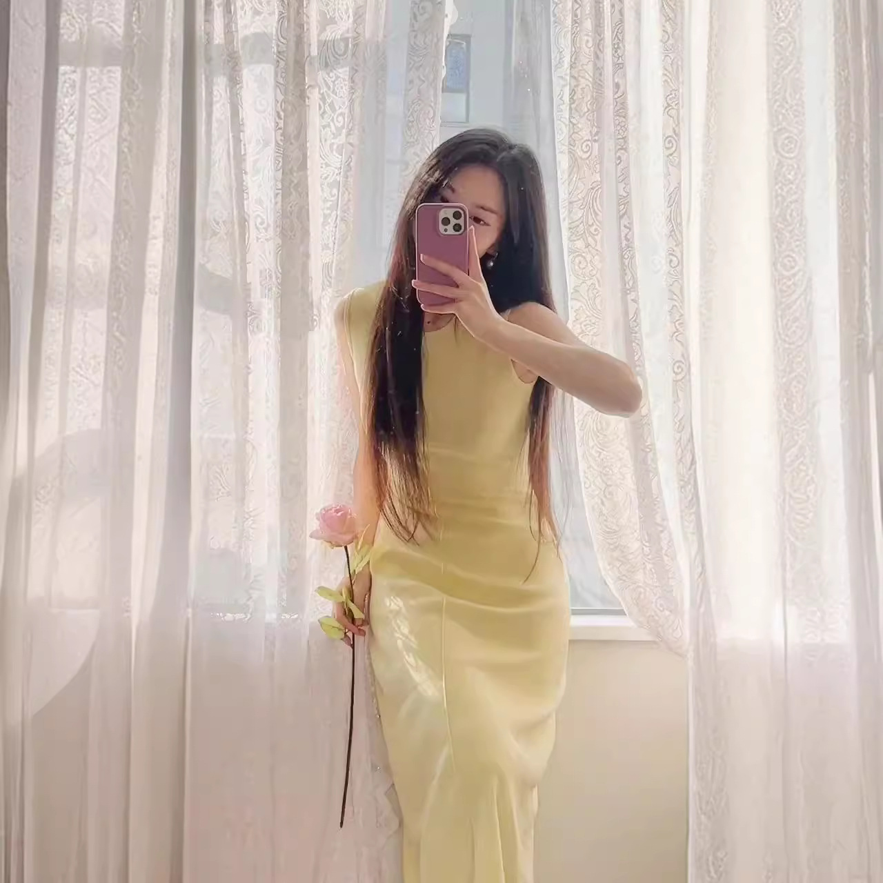 黄色针织连衣裙夏季女高级感无袖名媛风简约大气修身裙子