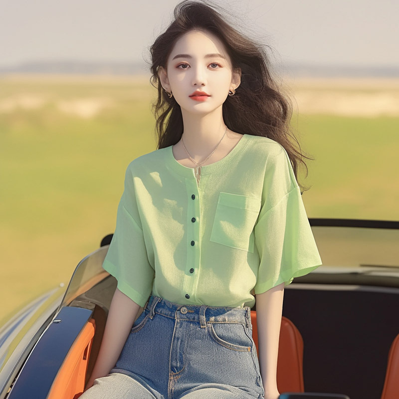 夏季多巴胺穿搭独特别致小衫高端上衣洋气减龄绿色短袖正肩衬衫女