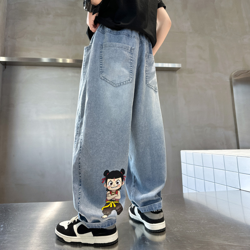 男童夏季轻薄防蚊牛仔裤2025新款男孩休闲长裤大童春秋裤卡通印花