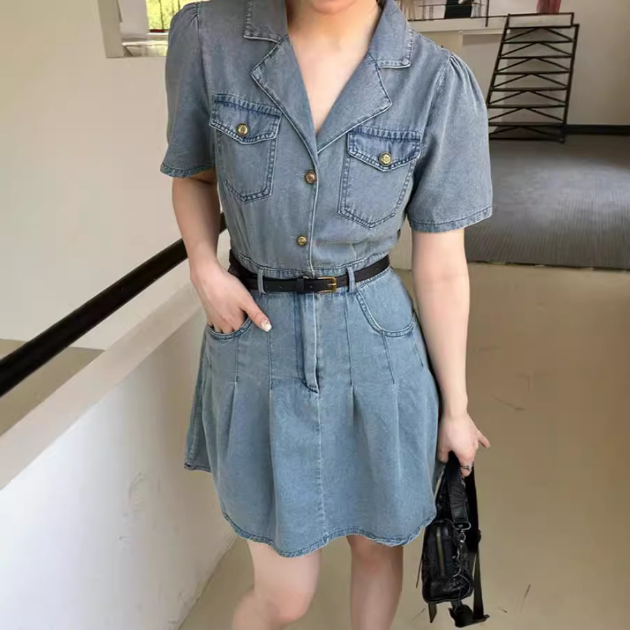 胖MM收腰短袖牛仔连衣裙早秋新款小众温柔高腰显瘦A字短裙