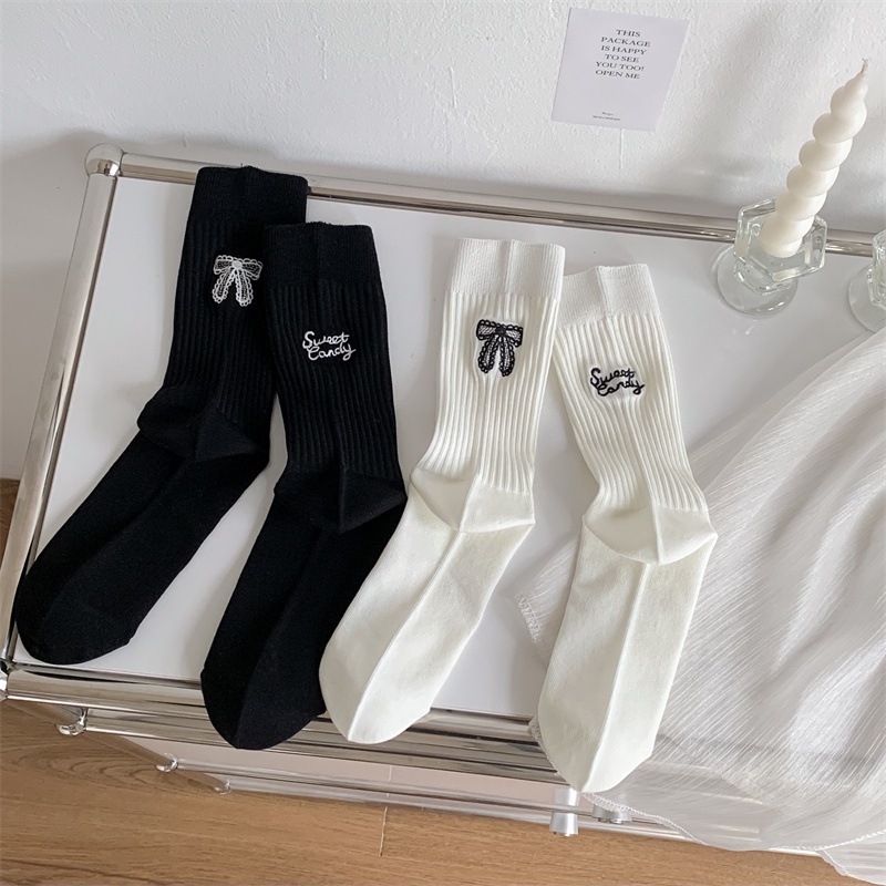2025春夏新款日系高级感蝴蝶结双针堆堆袜中筒袜子AB刺绣棉袜女袜