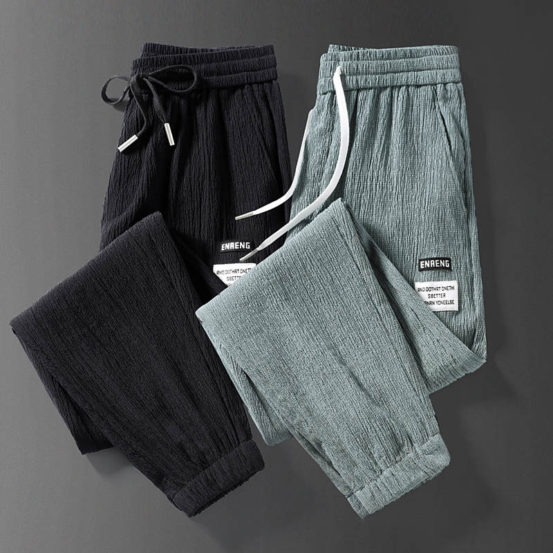 夏季薄款亚麻棉麻运动卫裤男士束脚宽松冰丝夏天九分休闲裤子男裤