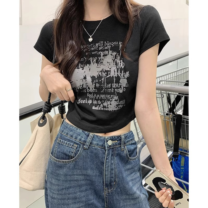 港味chin印花圆领正肩t恤上衣女夏季设计感小众褶皱收腰辣妹短袖