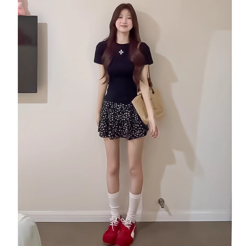 黑色韩版碎花短裙女夏季2025新款高腰显瘦a字裙防走光蛋糕半身裙