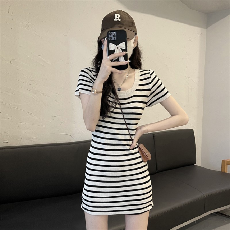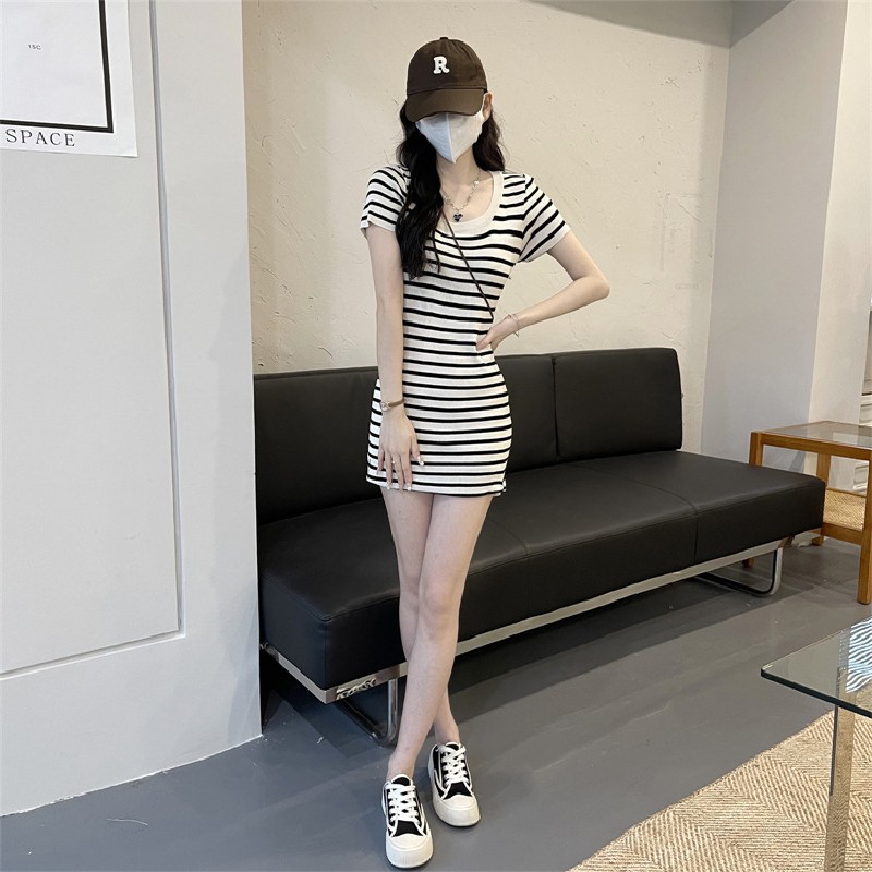 2025新款气质收腰修身小个子法式小众条纹短袖包臀连衣裙子夏季女