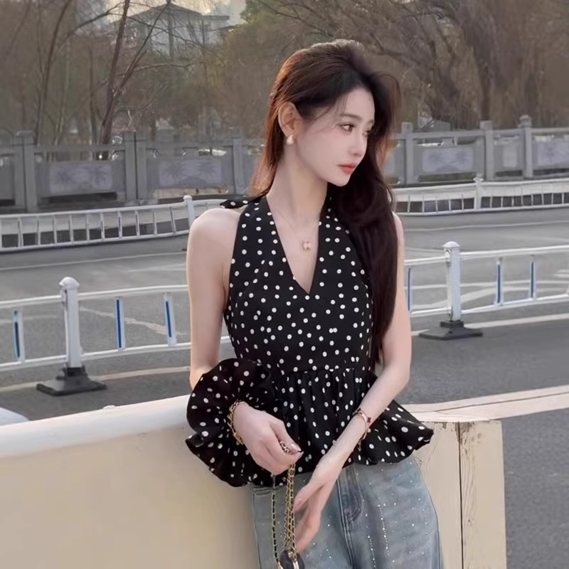 纯欲V领挂脖黑色波点无袖背心女夏季外穿设计感收腰露背小衫上衣