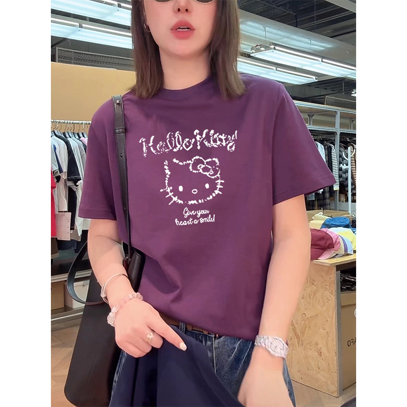正肩纯棉圆领短袖t恤女装时尚百搭洋气紫色上衣2025夏季新款流行
