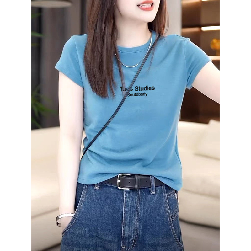 正肩纯棉短袖t恤女2025新款高级小众设计感修身显瘦蓝色上衣夏季
