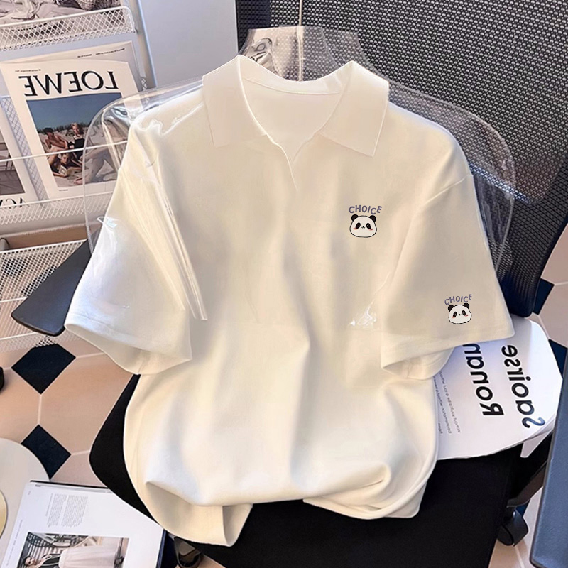 2025夏季新款白色短袖t恤女宽松百搭POLO领减龄显瘦卡通印花上衣