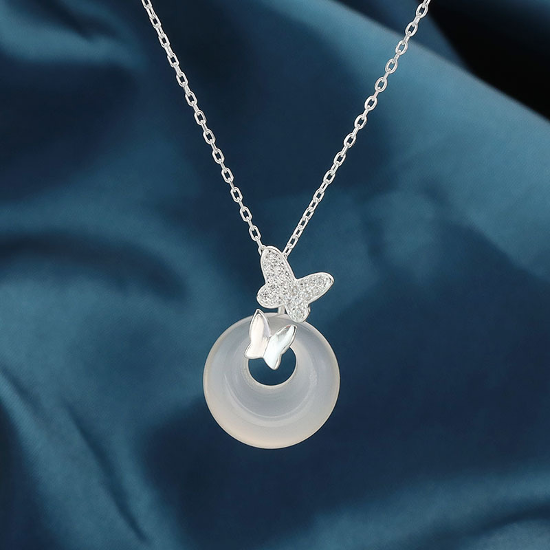 S990纯银蝶恋平安扣项链女生感百搭轻奢小众蝴蝶玉髓锁骨链女