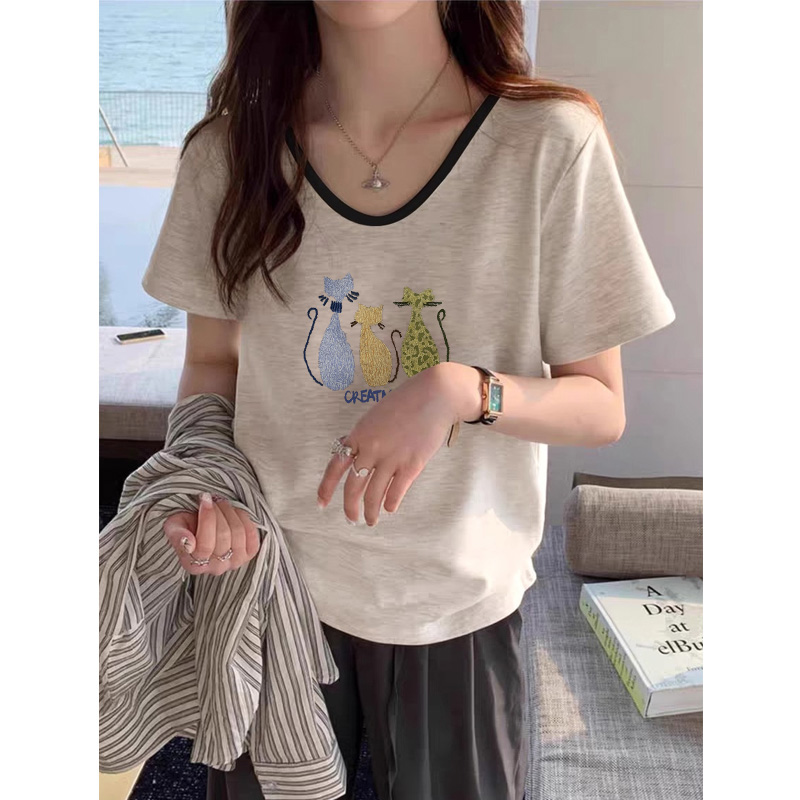 2025夏季新款花灰色v领短袖t恤女宽松百搭显瘦撞色减龄小个子上衣