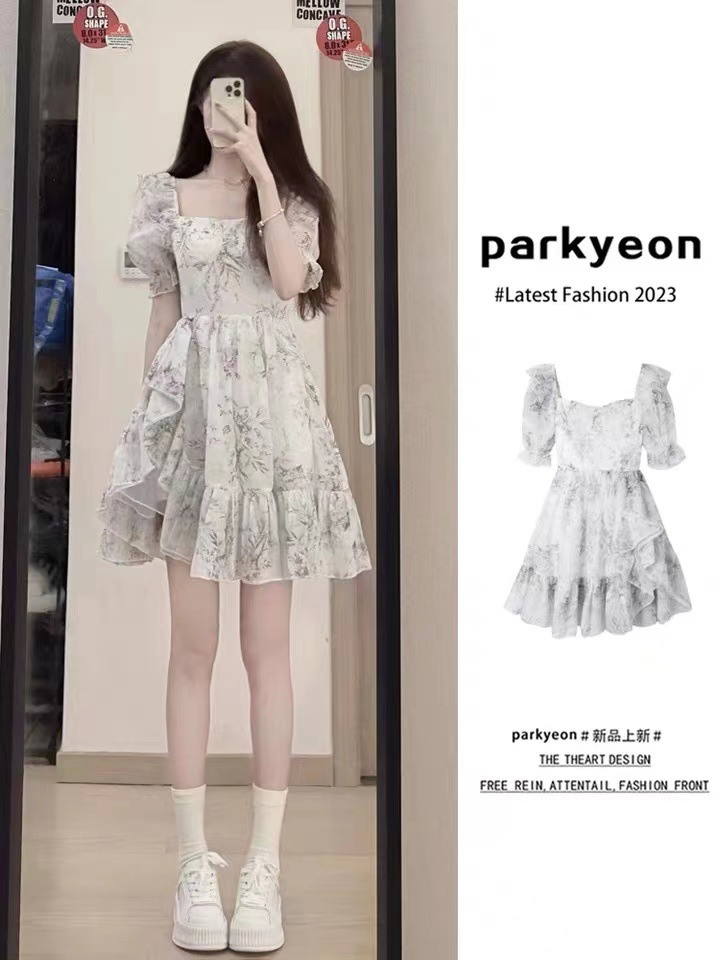 茶歇法式碎花泡泡袖连衣裙夏季女新款甜美小个子a字蓬蓬裙