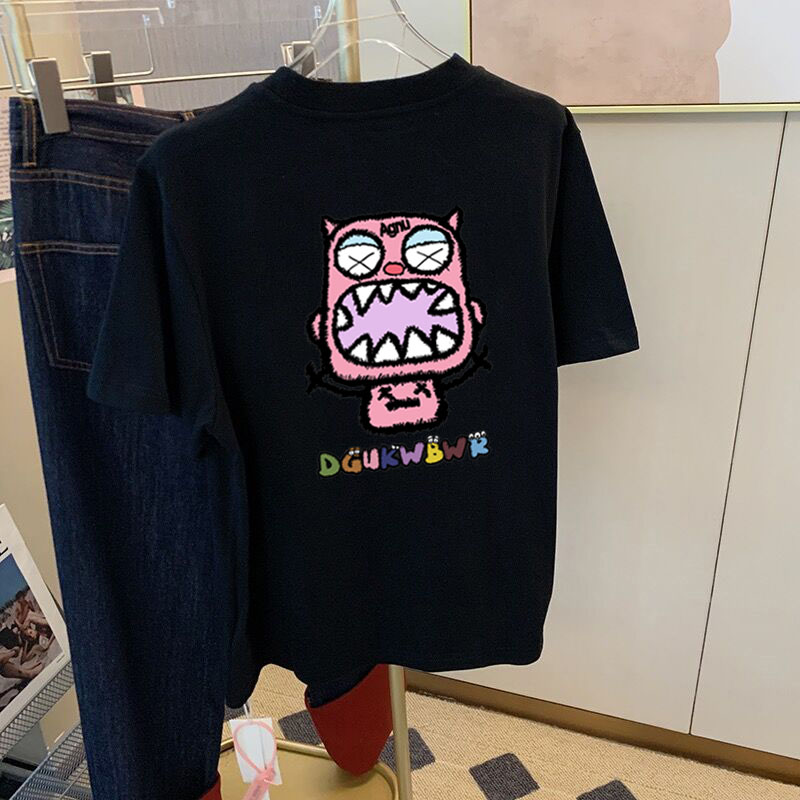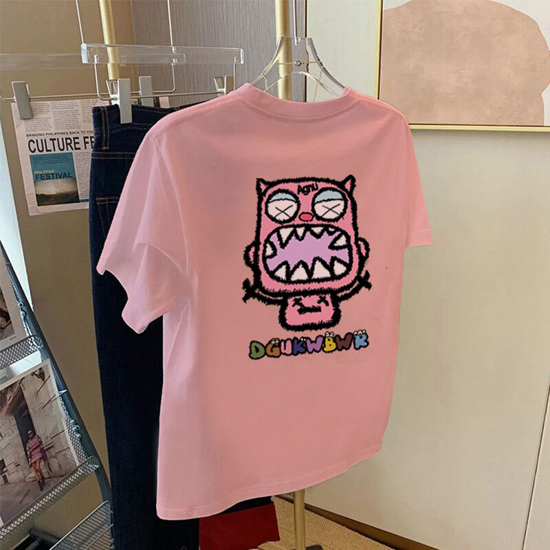 2025夏季新款正肩纯棉白色短袖t恤女小怪兽印花宽松百搭小众上衣