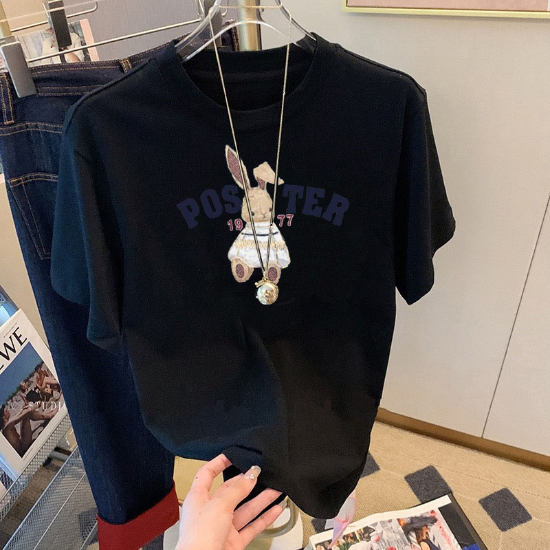 2025夏季新款杏色正肩纯棉短袖t恤女卡通兔子印花宽松百搭上衣ins