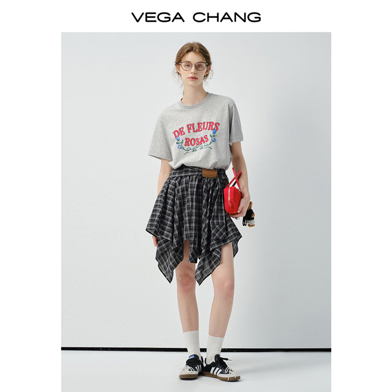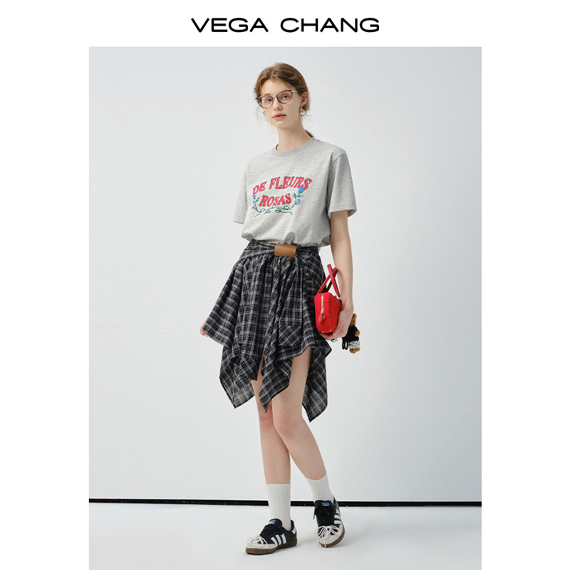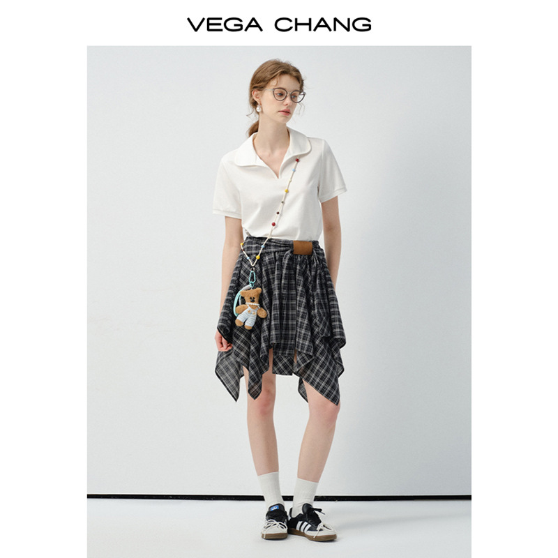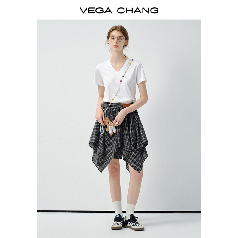 VEGACHANG半身裙女2025春夏新款不规则设计下摆经典黑白格纹短裙
