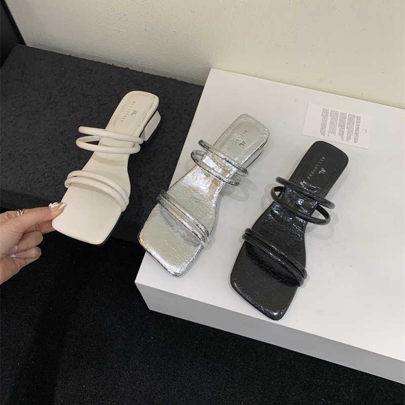 简约细带日常凉拖鞋女夏季新款银色外穿软底舒适中跟一字拖