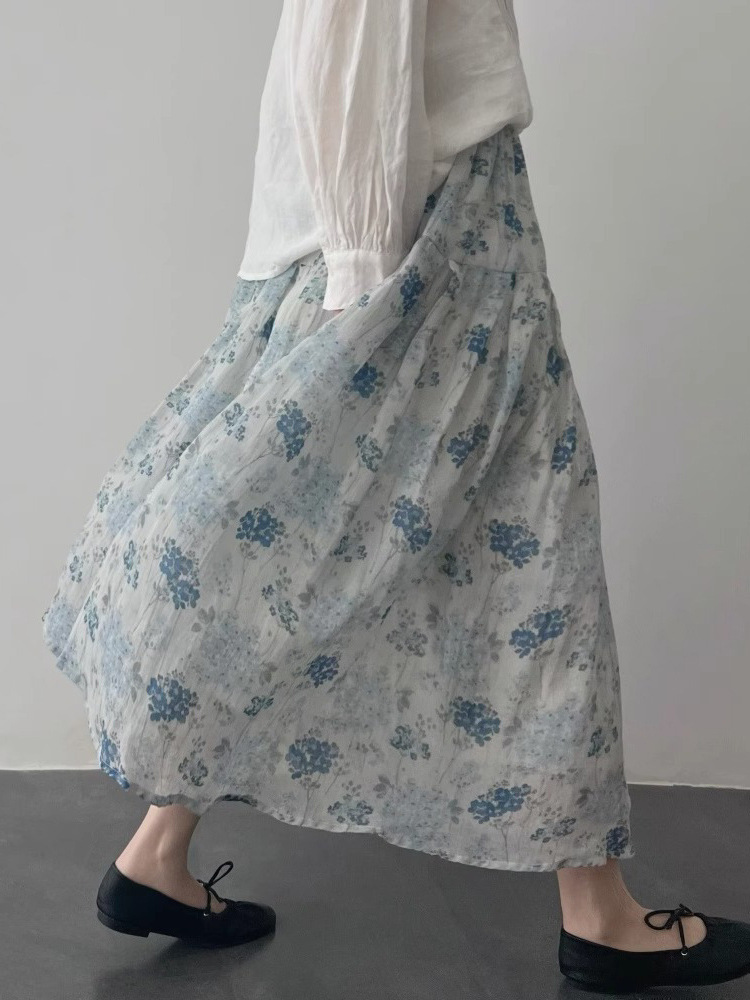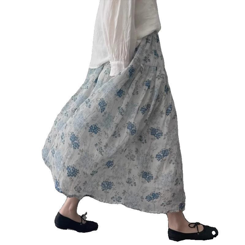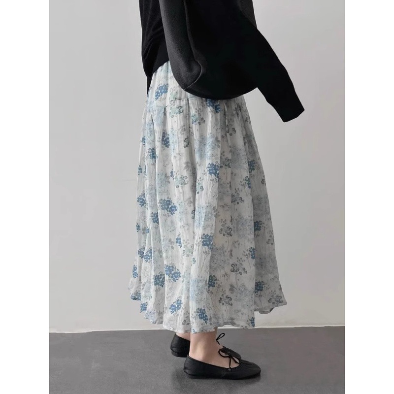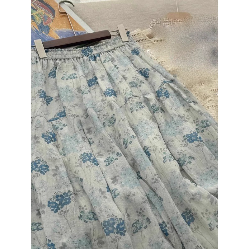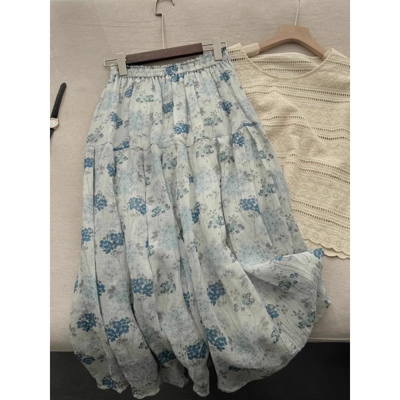 Rixo Hope法式复古森系蓝色碎花半身裙女夏中长款扎染半裙子