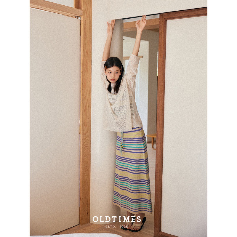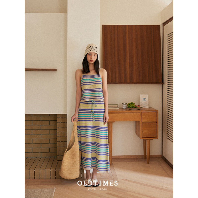 叙旧oldtimes 夏日度假风舒适棉麻彩色条纹抽绳A字半身裙套装女