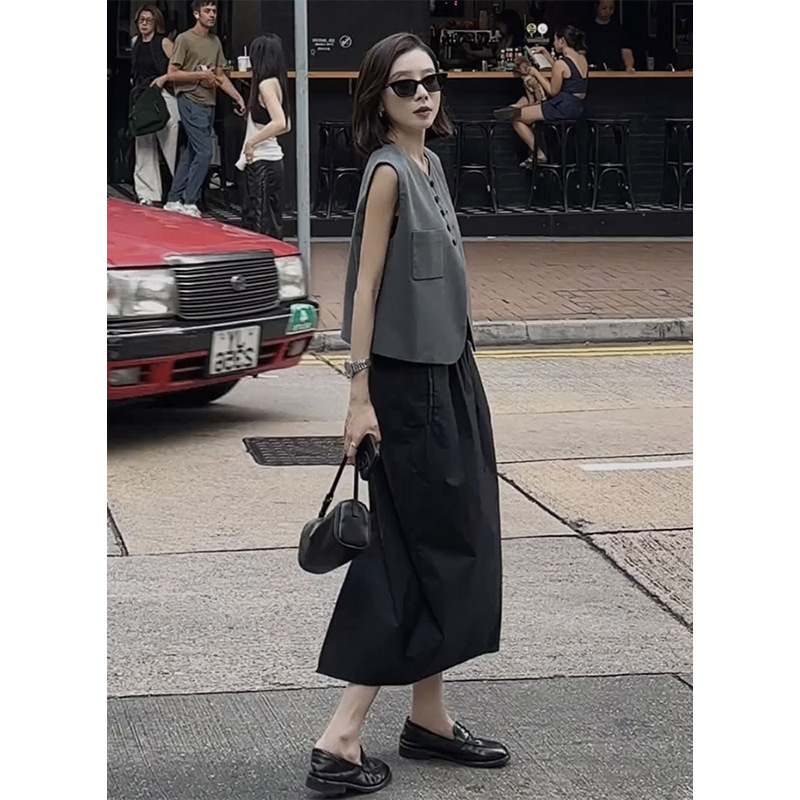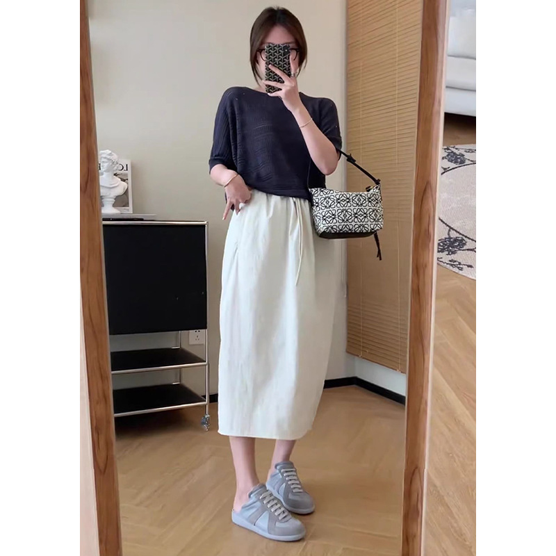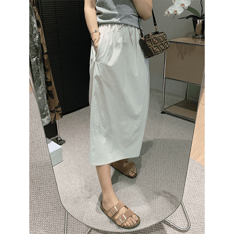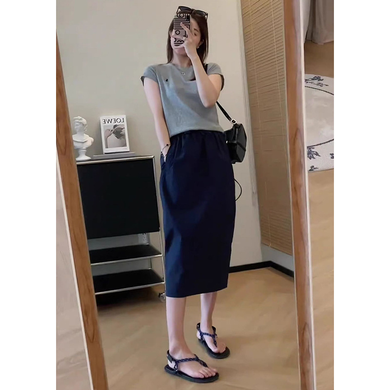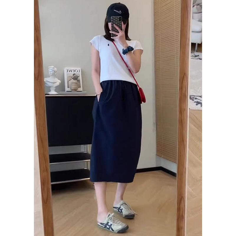 藏蓝色山系休闲半身裙女夏季薄款抽绳高腰宽松开叉速干空气花苞裙