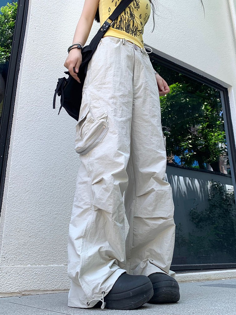 美式褶皱机能阔腿工装裤女夏季新款高腰宽松休闲裤拖地长裤子
