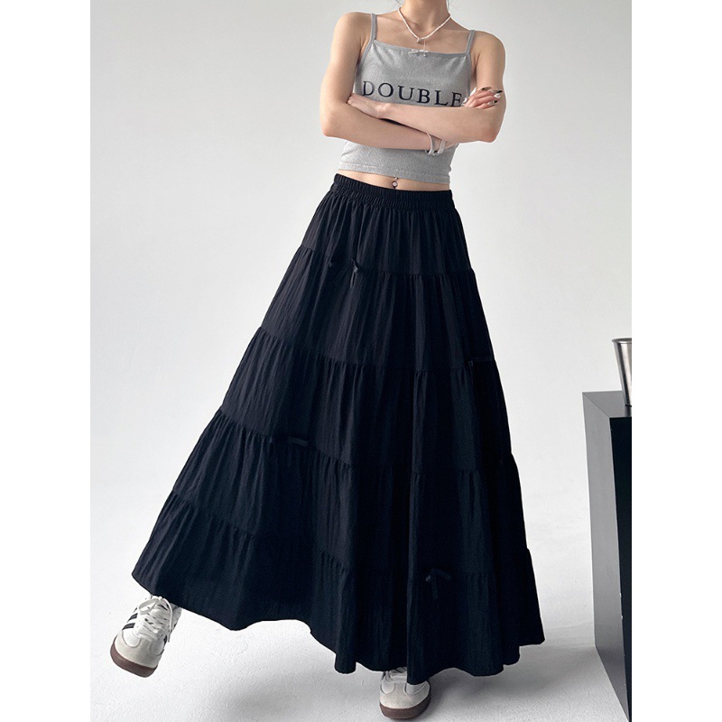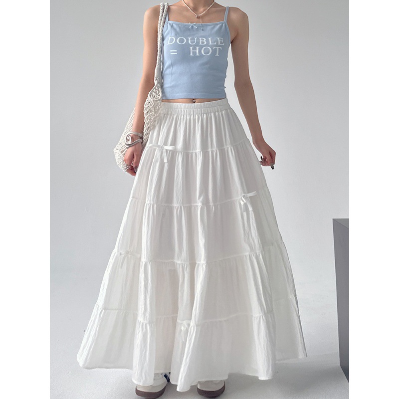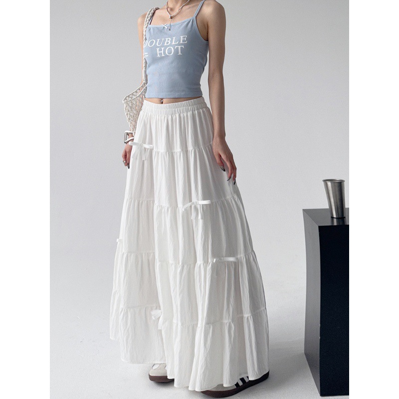 春夏白色半身裙女新款高腰复古宽松蝴蝶结气质中款a字裙