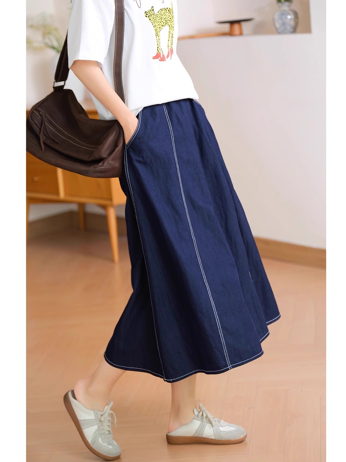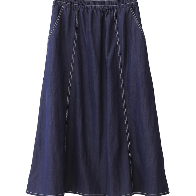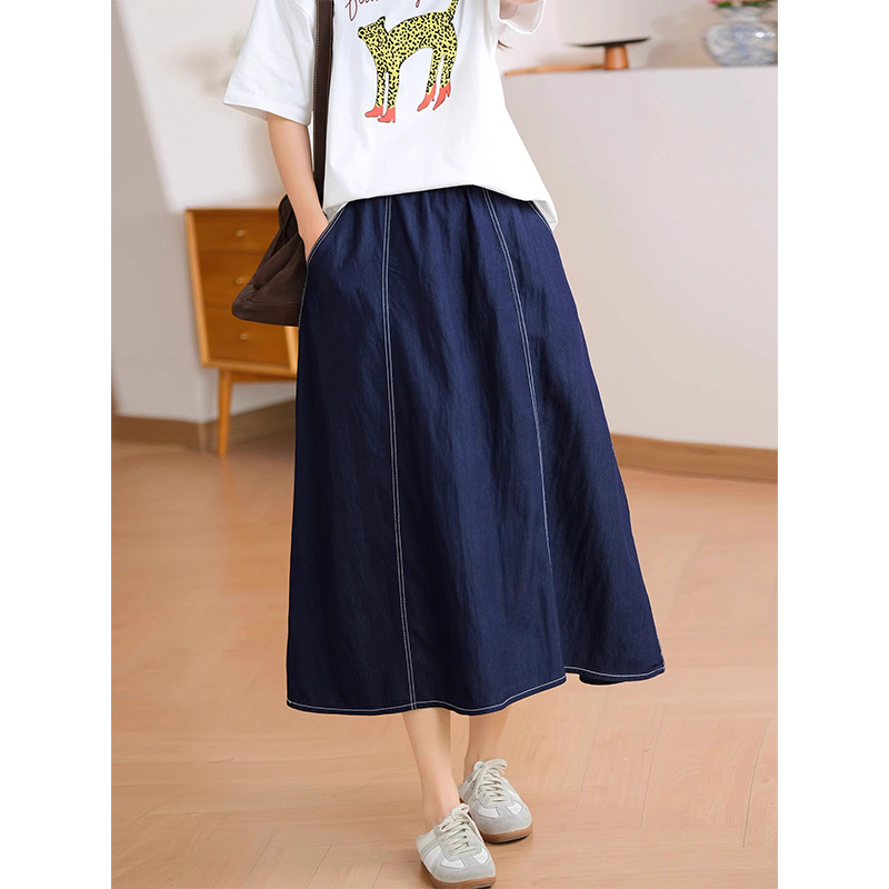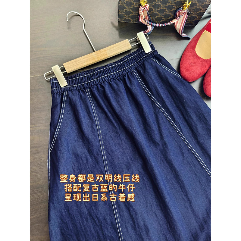丹宁蓝牛仔半身裙女士夏季出游穿搭松紧腰显瘦小个子中长款A字裙