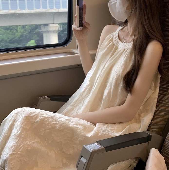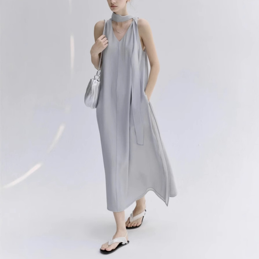 吊带露肩连衣裙V领宽松垂感飘带A字无袖长裙
