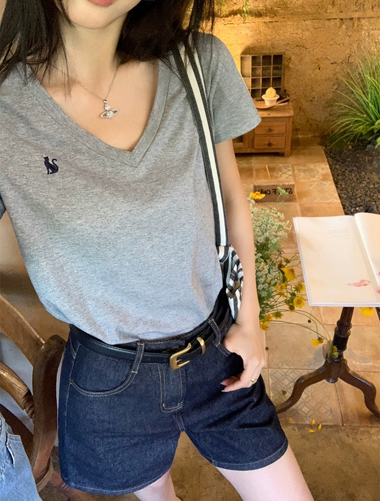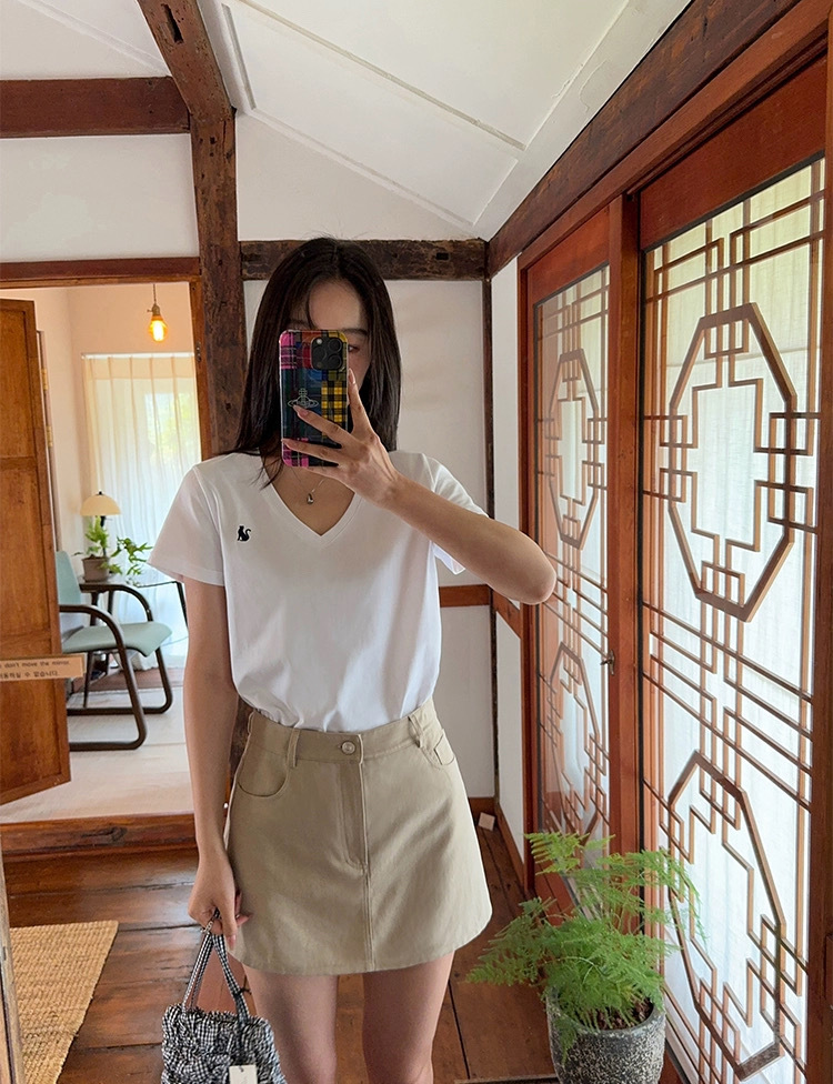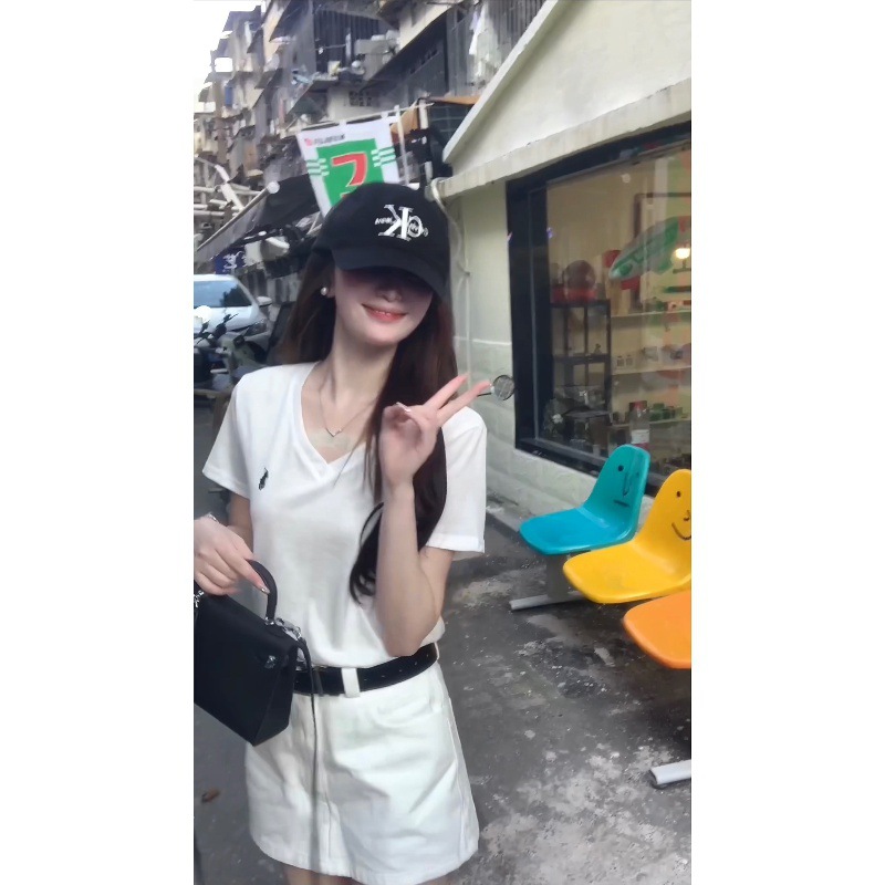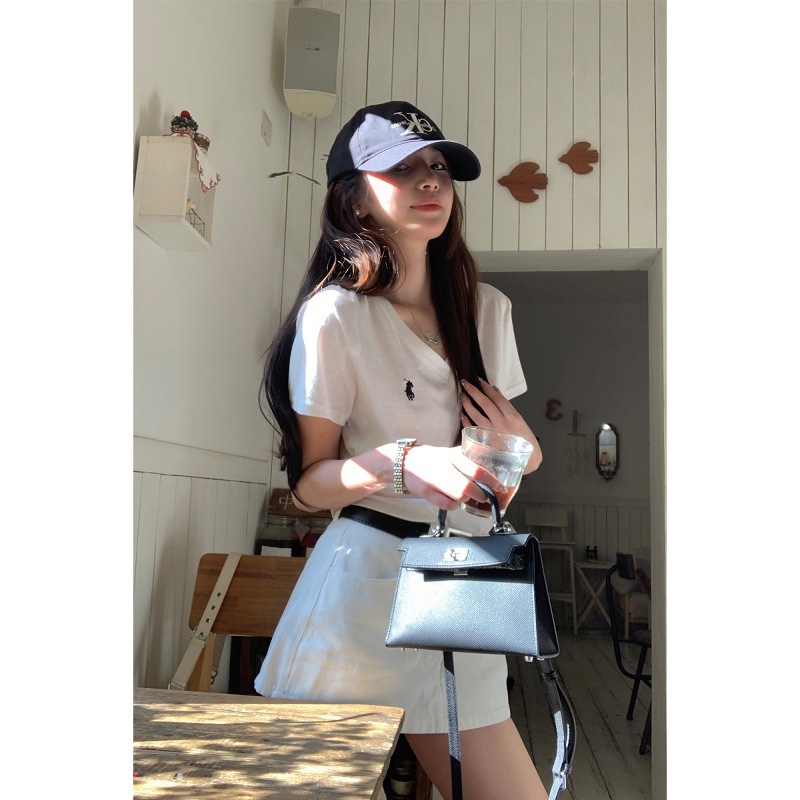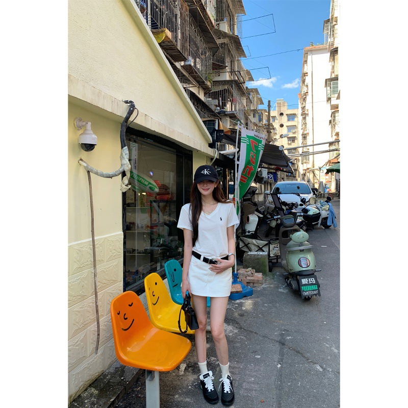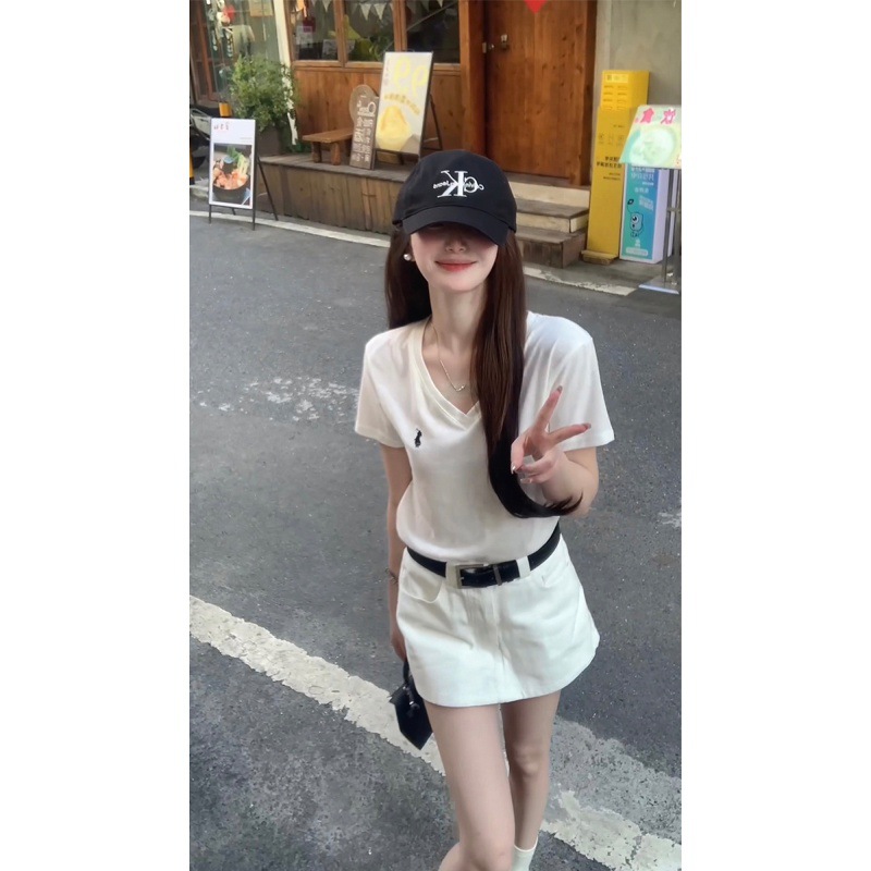 Peaceonesoul自制正肩基础白色V领刺绣短袖t恤女夏季极简宽松上衣