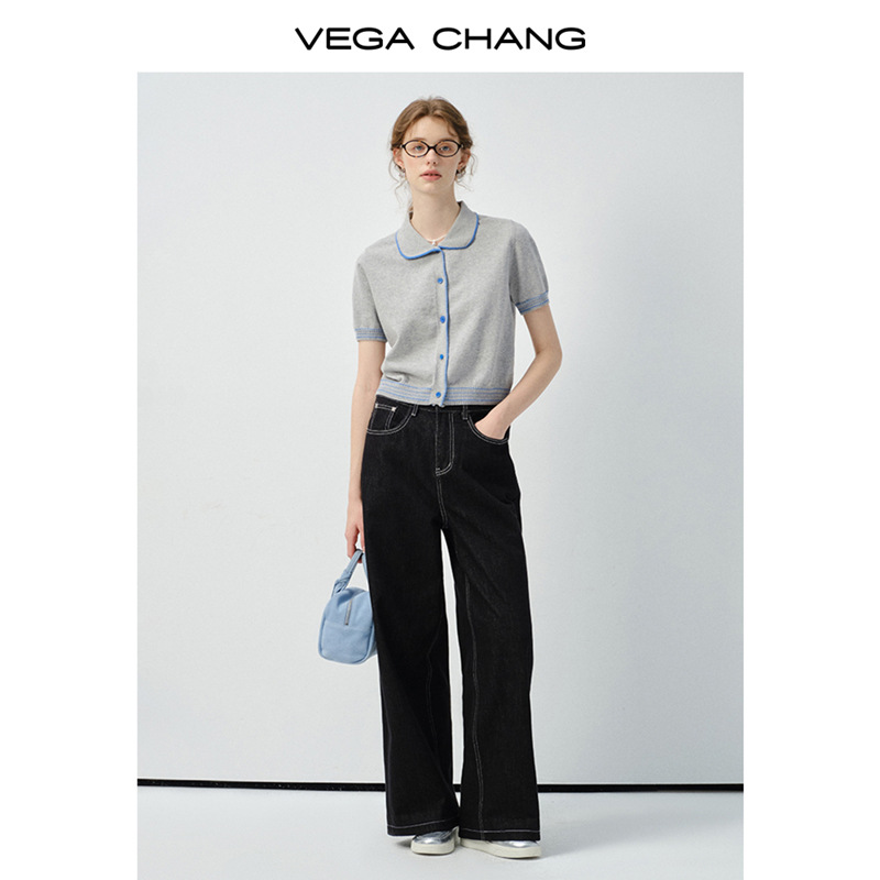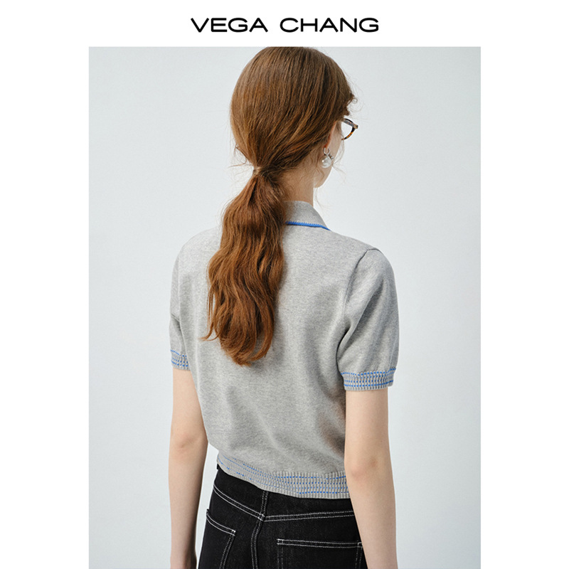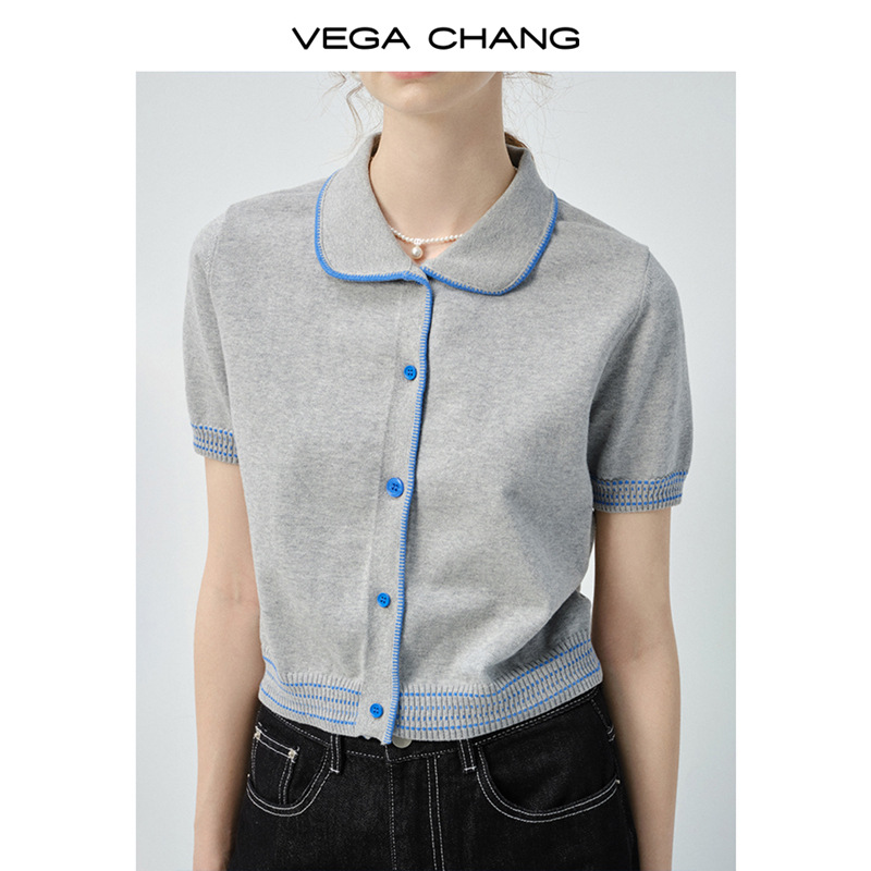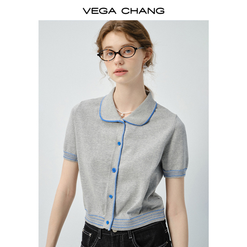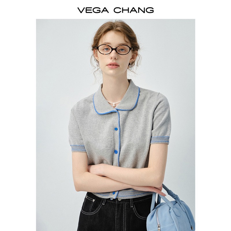 VEGA CHANG女士百搭针织衫2025春夏新款韩系撞色翻领针织开衫上衣