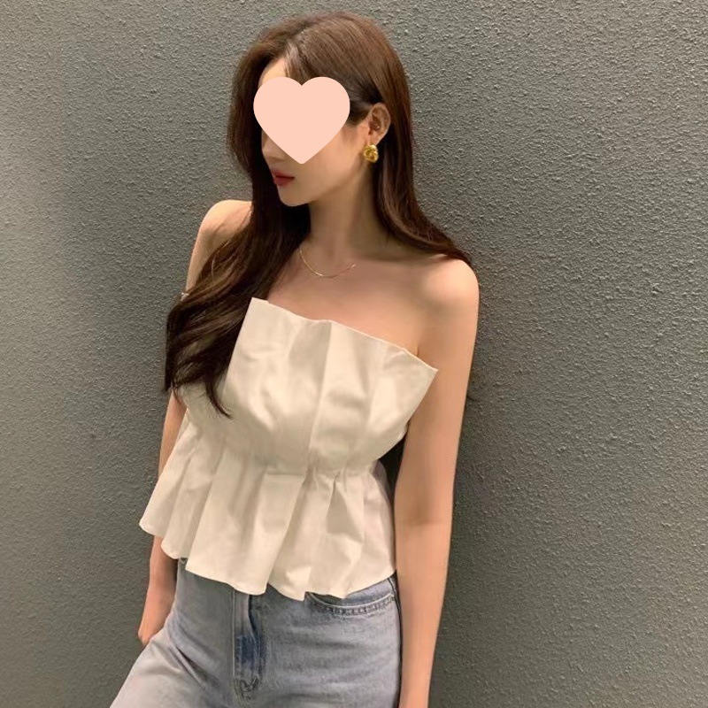 法式上衣夏女chic设计感小众纯欲风露肩立体花瓣褶皱抹胸背心