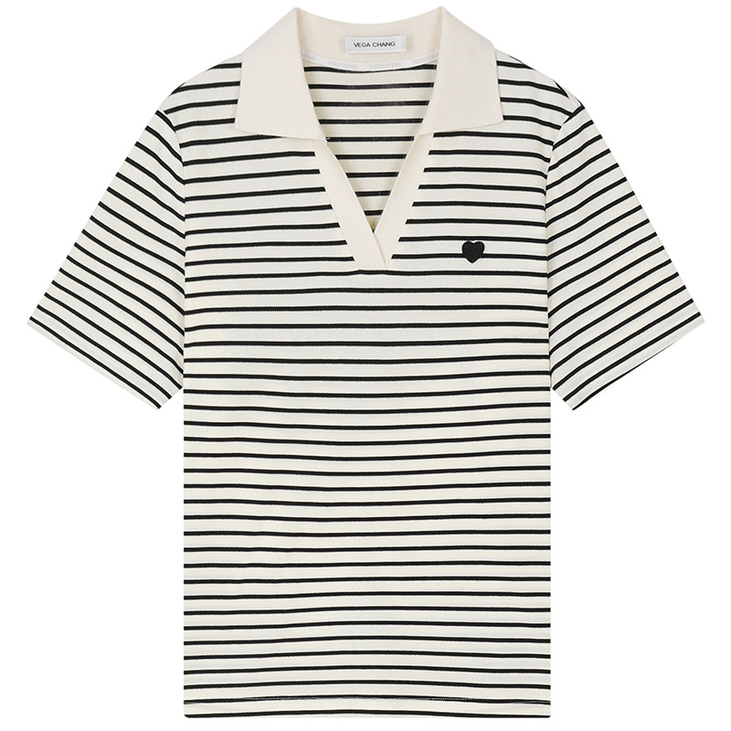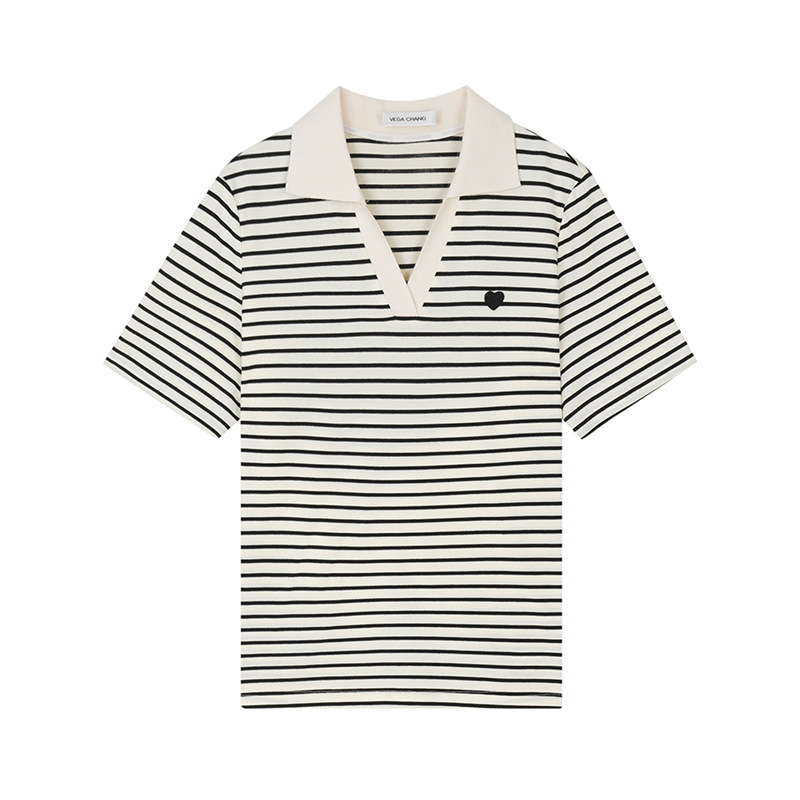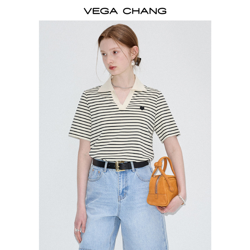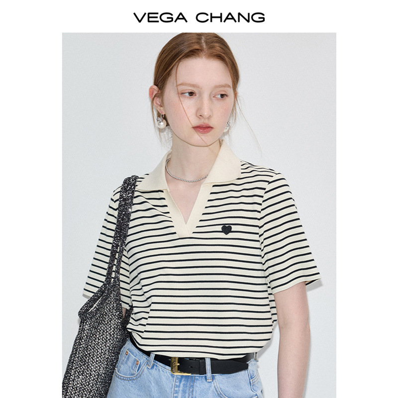 VEGA CHANG短袖T恤女年夏季新款撞色条纹POLO领休闲百搭上衣