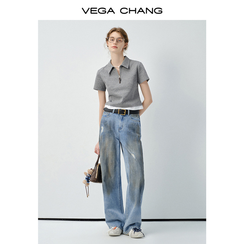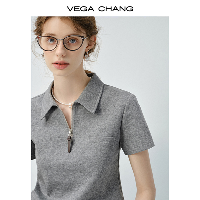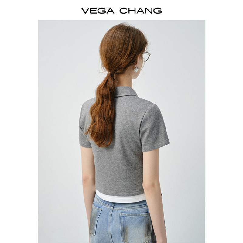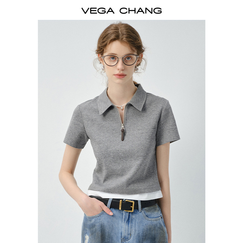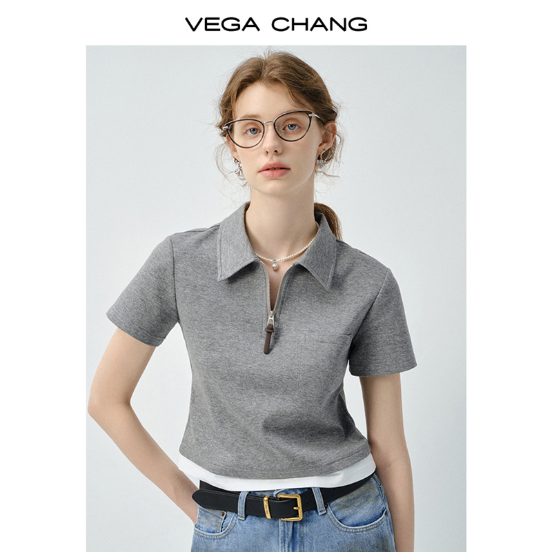 VEGA CHANG短袖T恤女2025新款夏季休闲简约设计感假两件翻领上衣