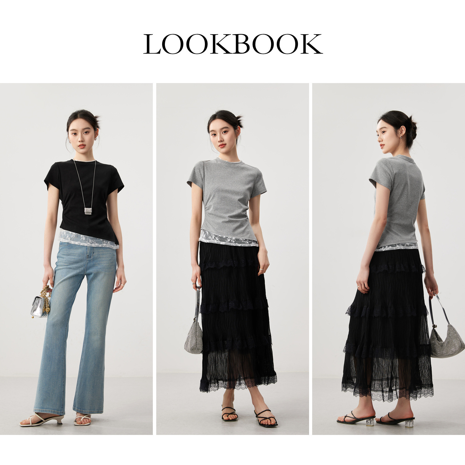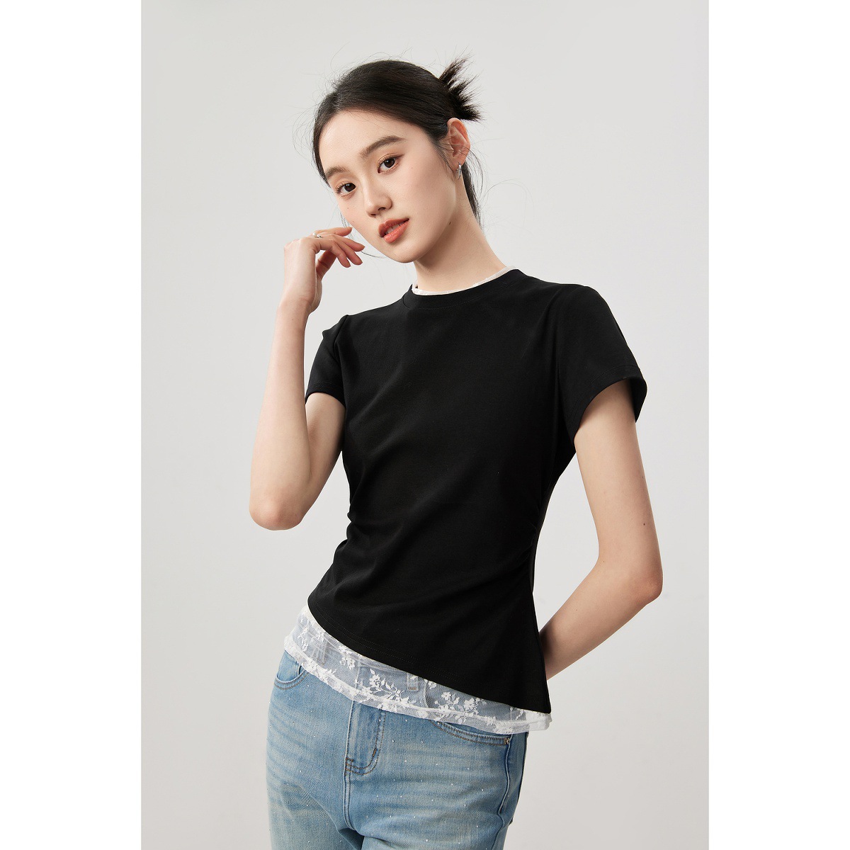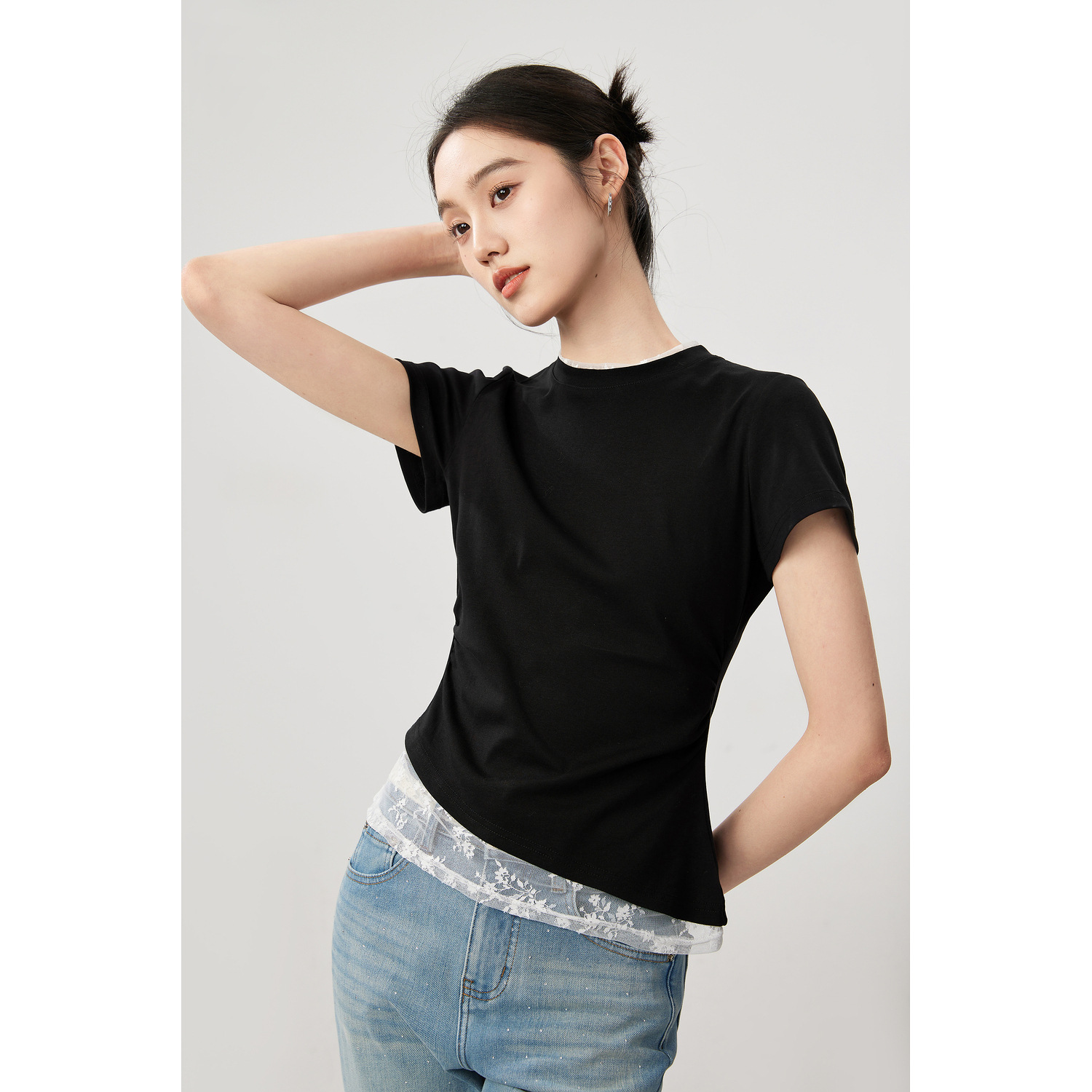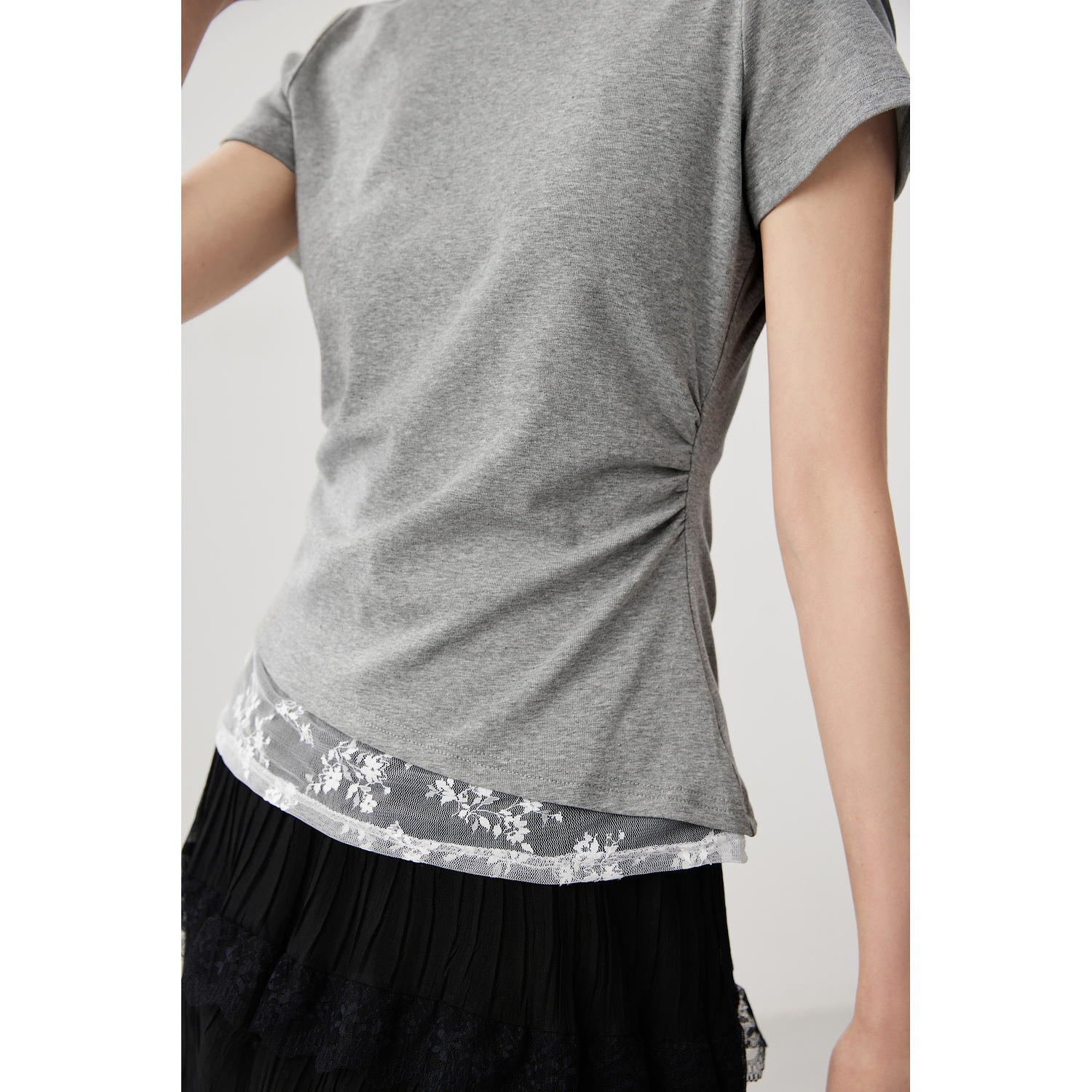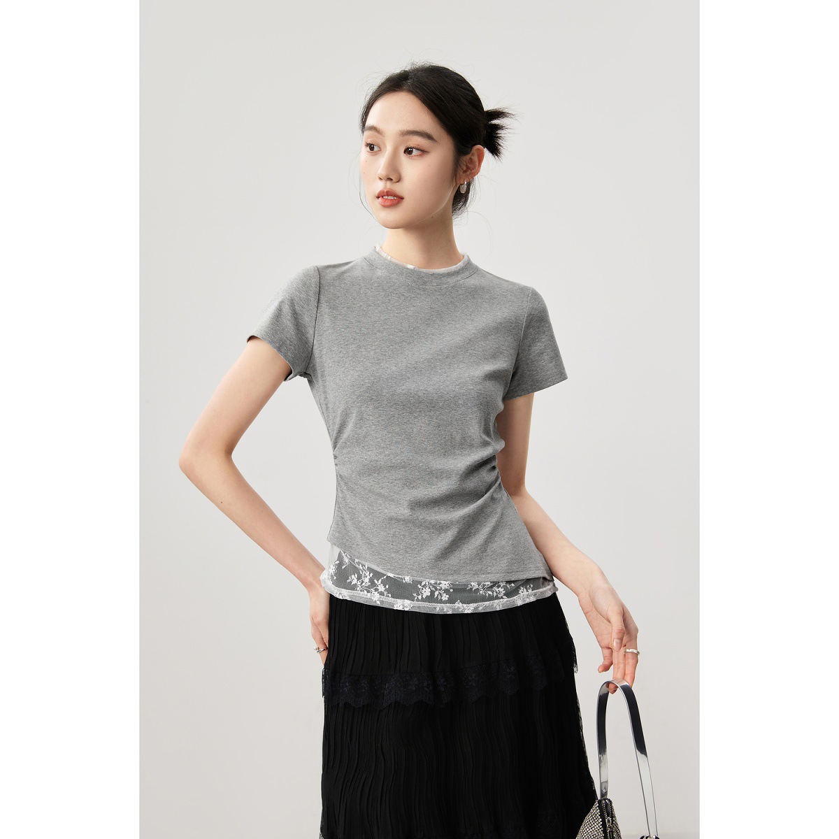 【小蛮腰肤感T 】时髦洋气蕾丝拼接 腰部抽褶高弹显瘦修身短袖T恤