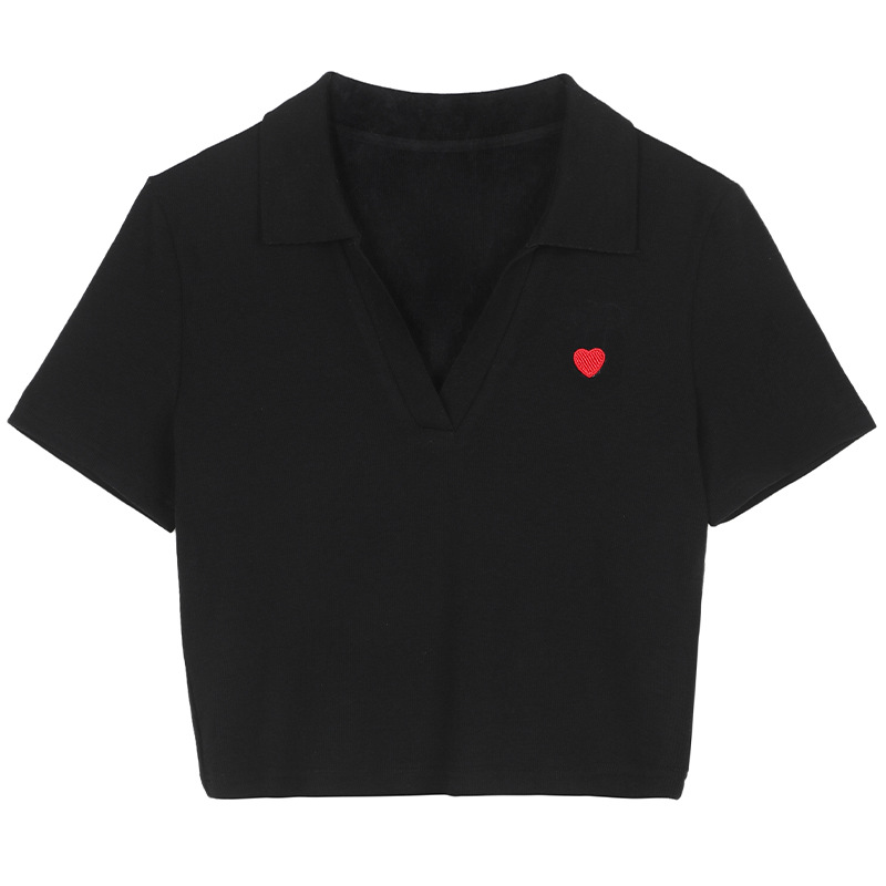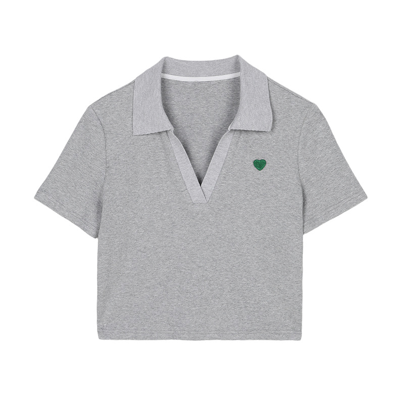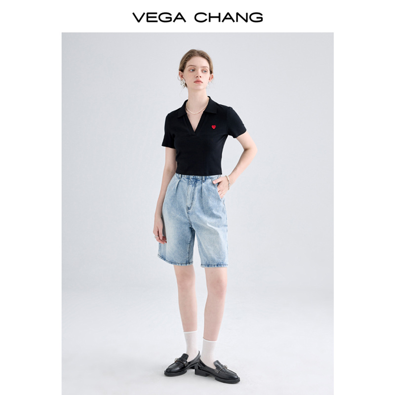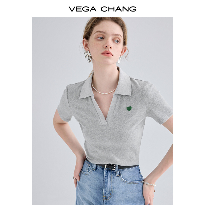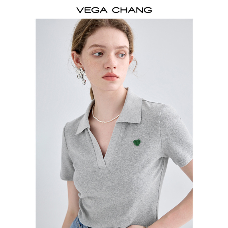 VEGACHANG爱心针织t恤女2025夏款设计感polo领法式短袖提花上衣