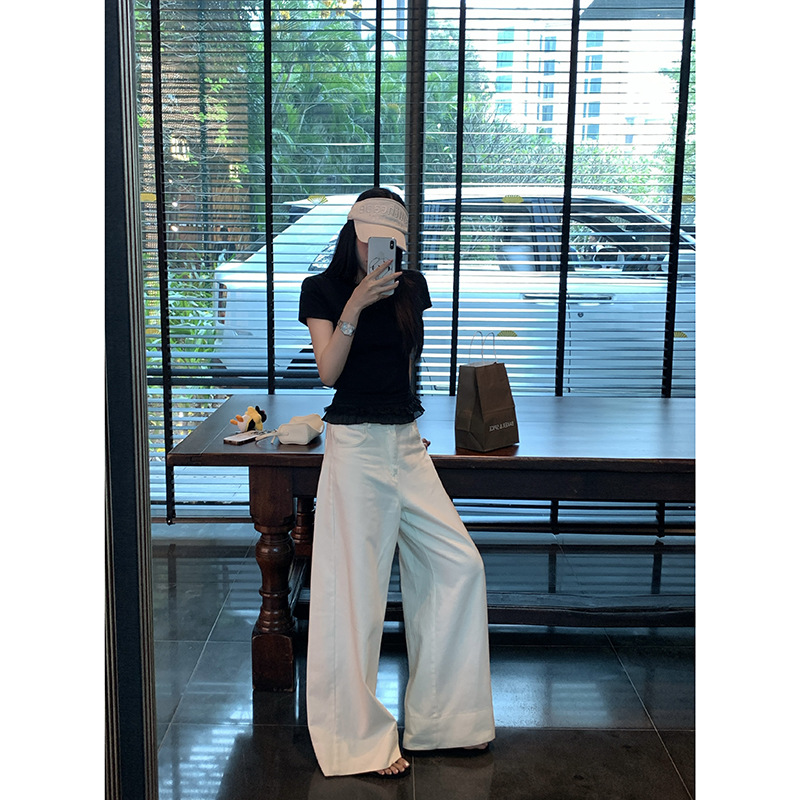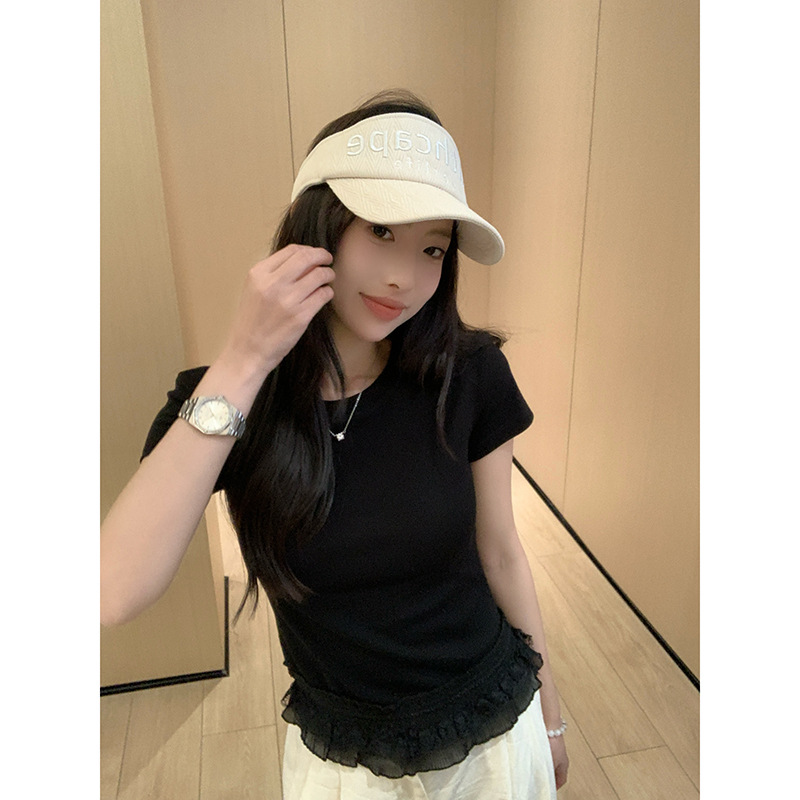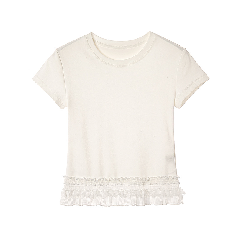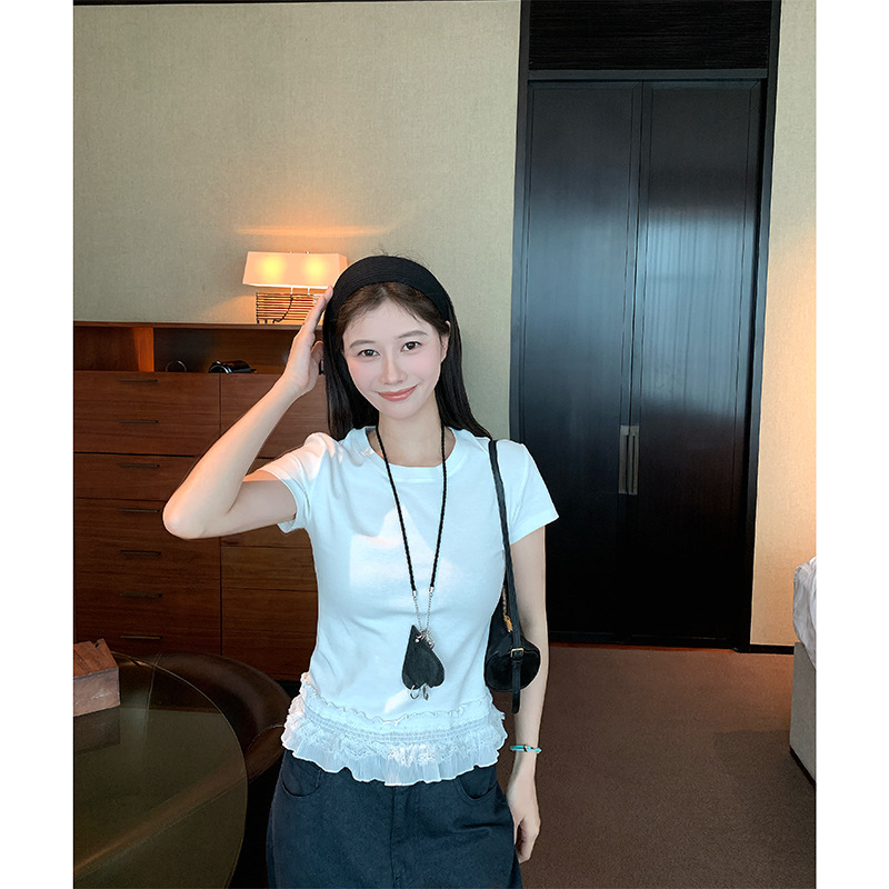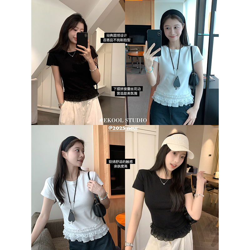【不一样的T】蕾丝花边拼接短袖T恤女夏季新款短款正肩上衣