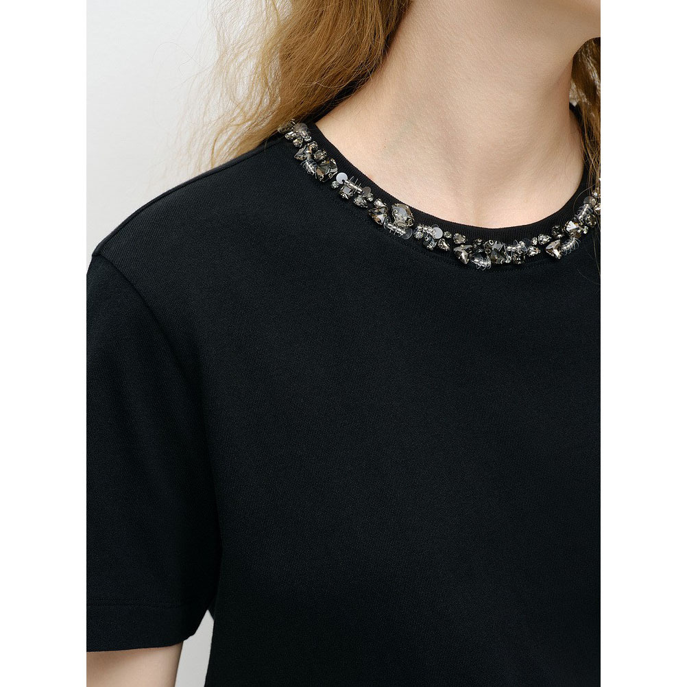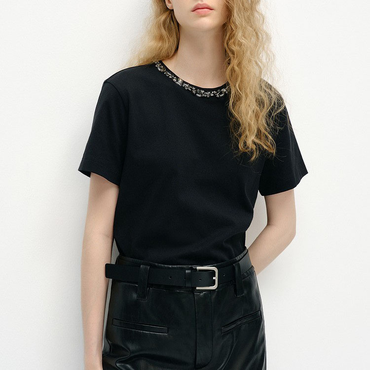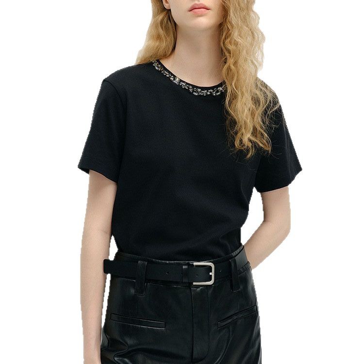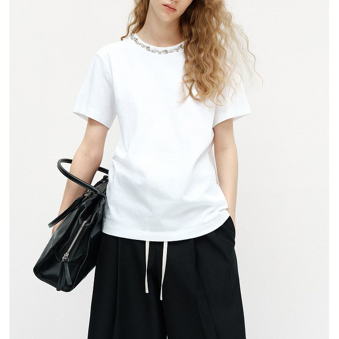 短袖T恤2025春夏新品棉质手工钉钻露背捏褶圆领白色