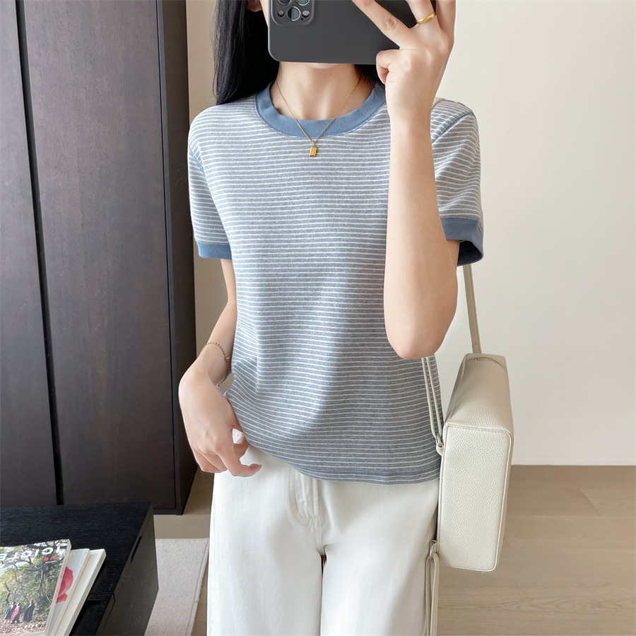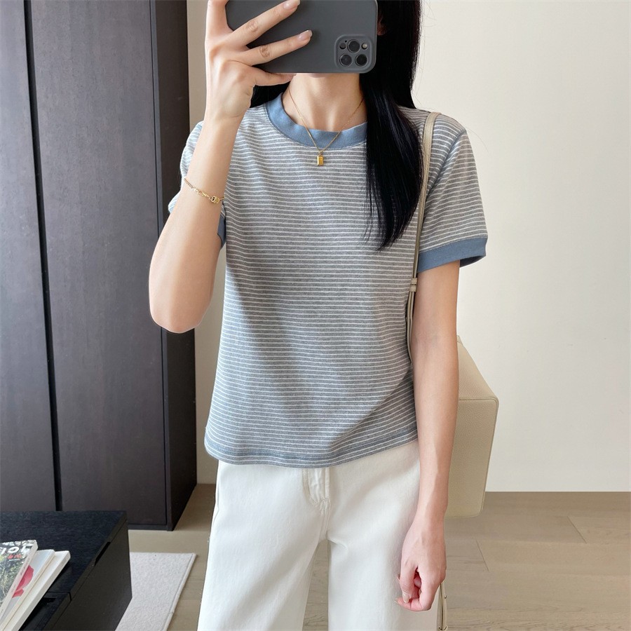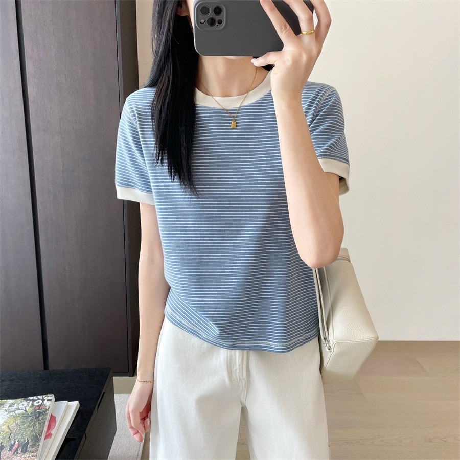 欧洲站欧货新疆棉撞色小条纹短袖T恤休闲圆领正肩短款上衣女夏季