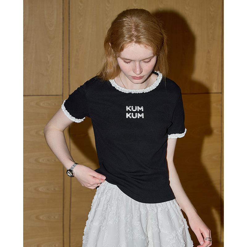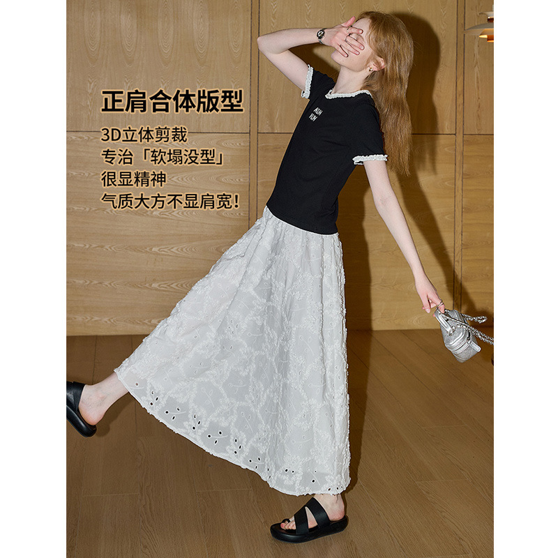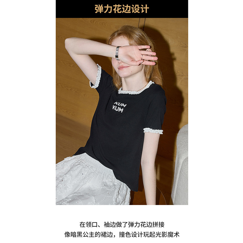 甜辣少女风花边拼接短袖T恤女2025年夏新款修身短款上衣