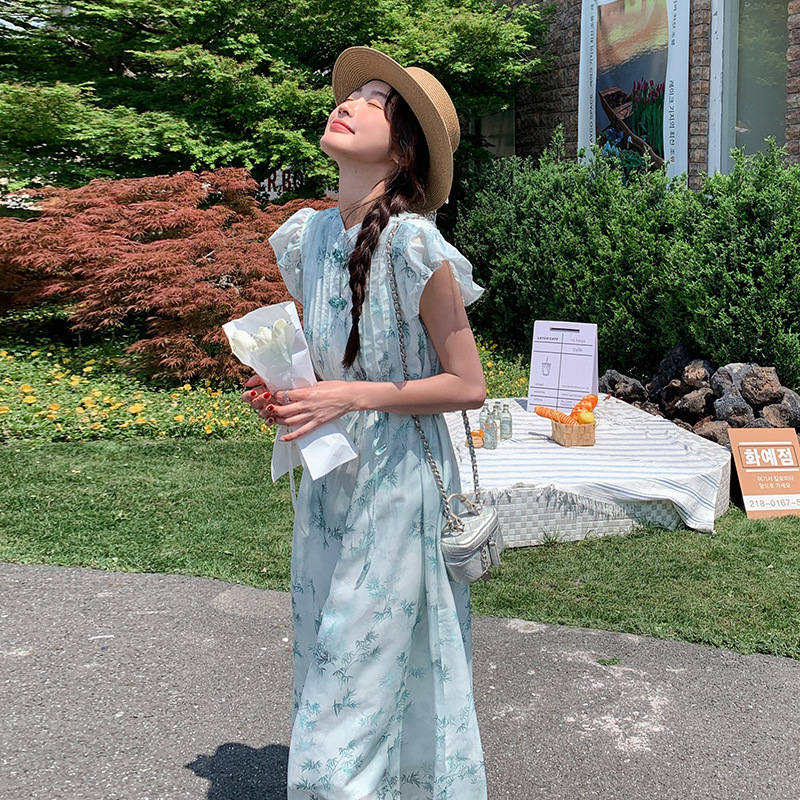 款法式茶歇气质中式盘扣法式温柔新款风v领短袖碎花连衣裙女