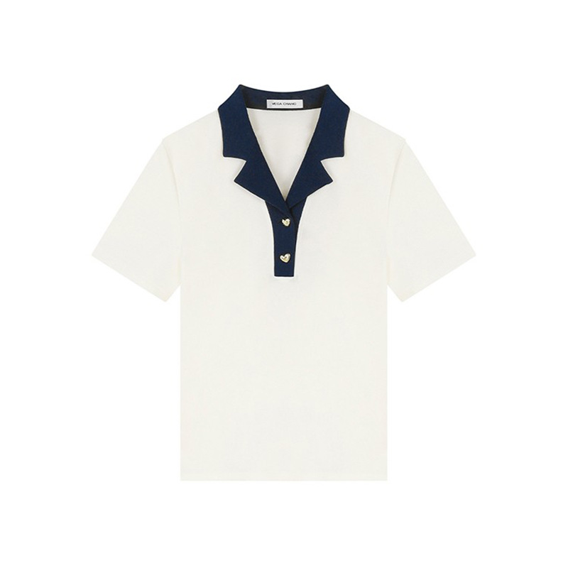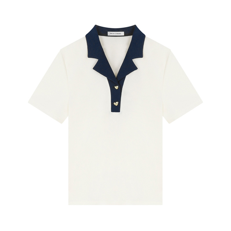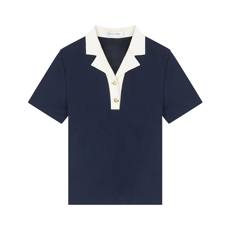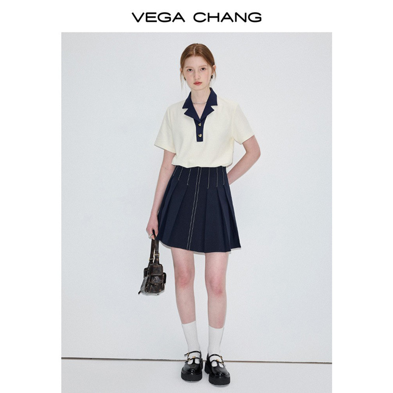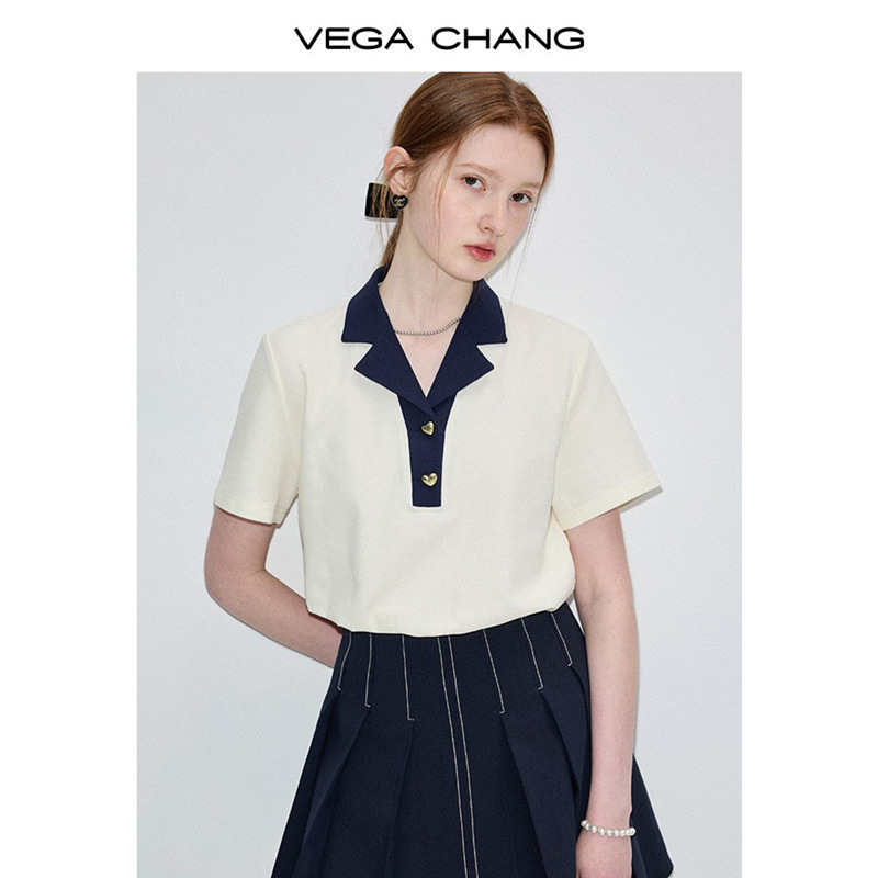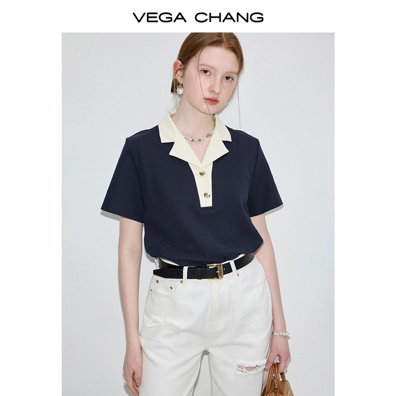 VEGA CHANG短袖T恤女2025年夏季新款复古时髦撞色POLO领正肩上衣