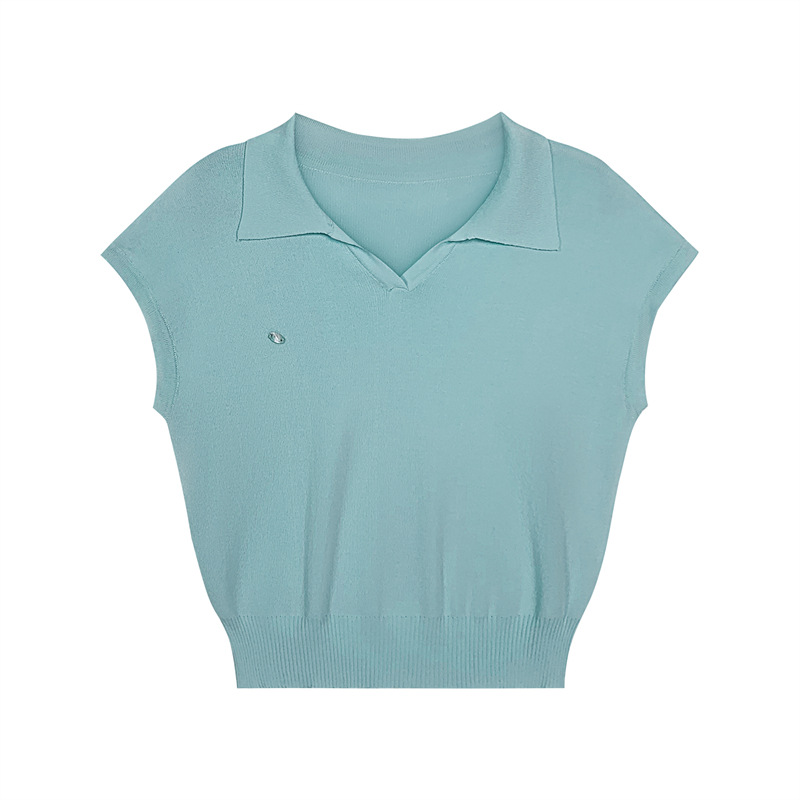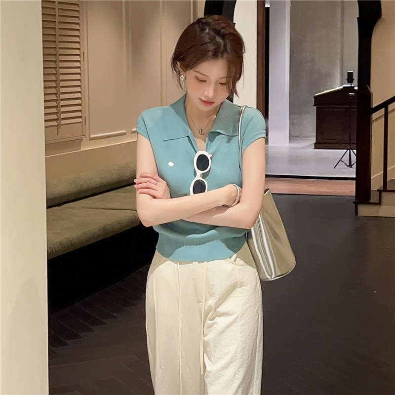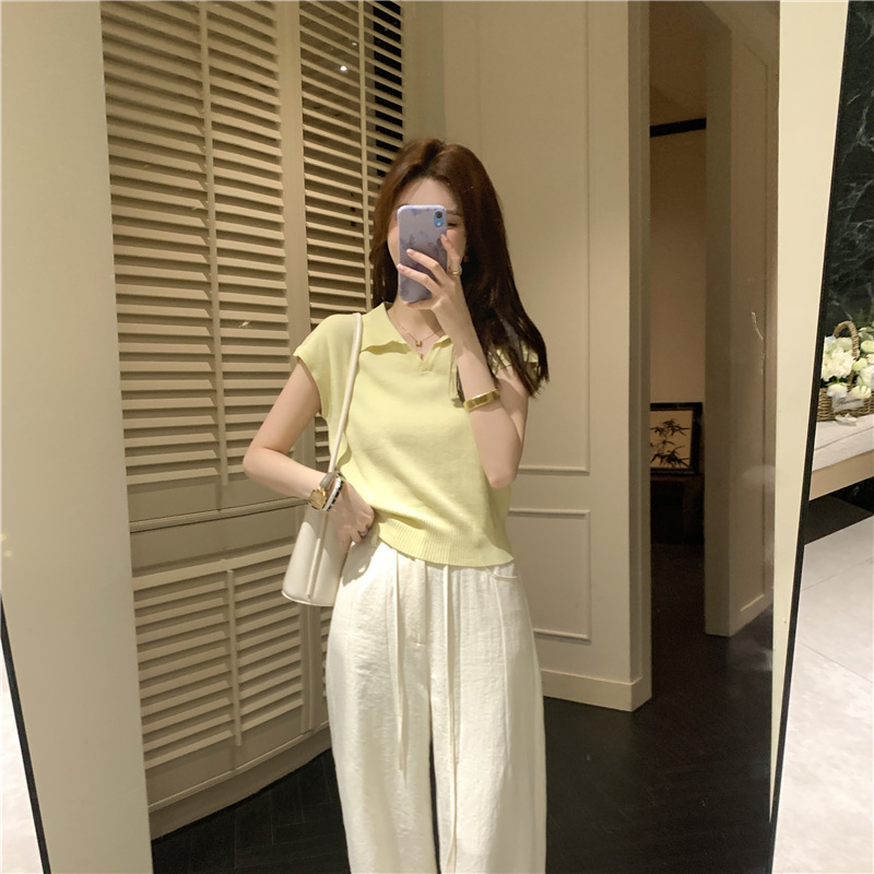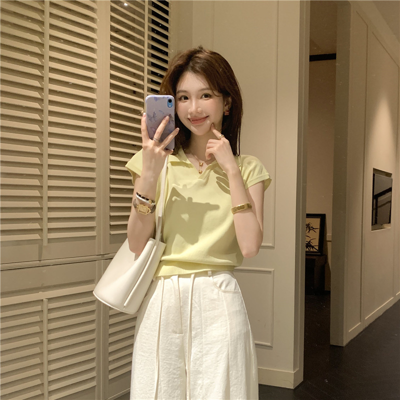 芝士◆不费力的时髦老钱风翻领针织衫T恤女夏季薄款短袖天丝上衣