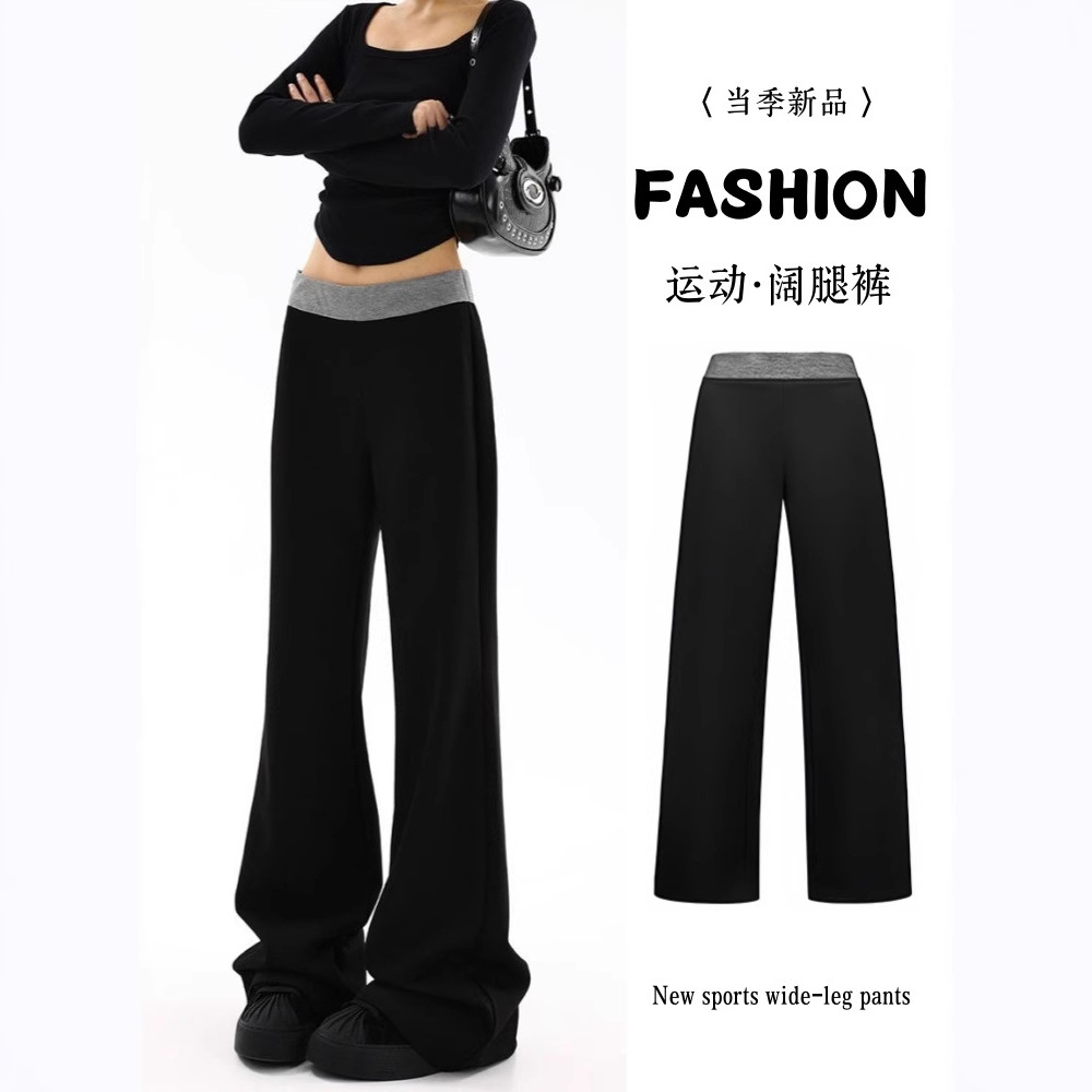 加绒黑色拼接休闲裤女秋冬大码胖mm宽松显瘦梨形身材阔腿运动卫裤