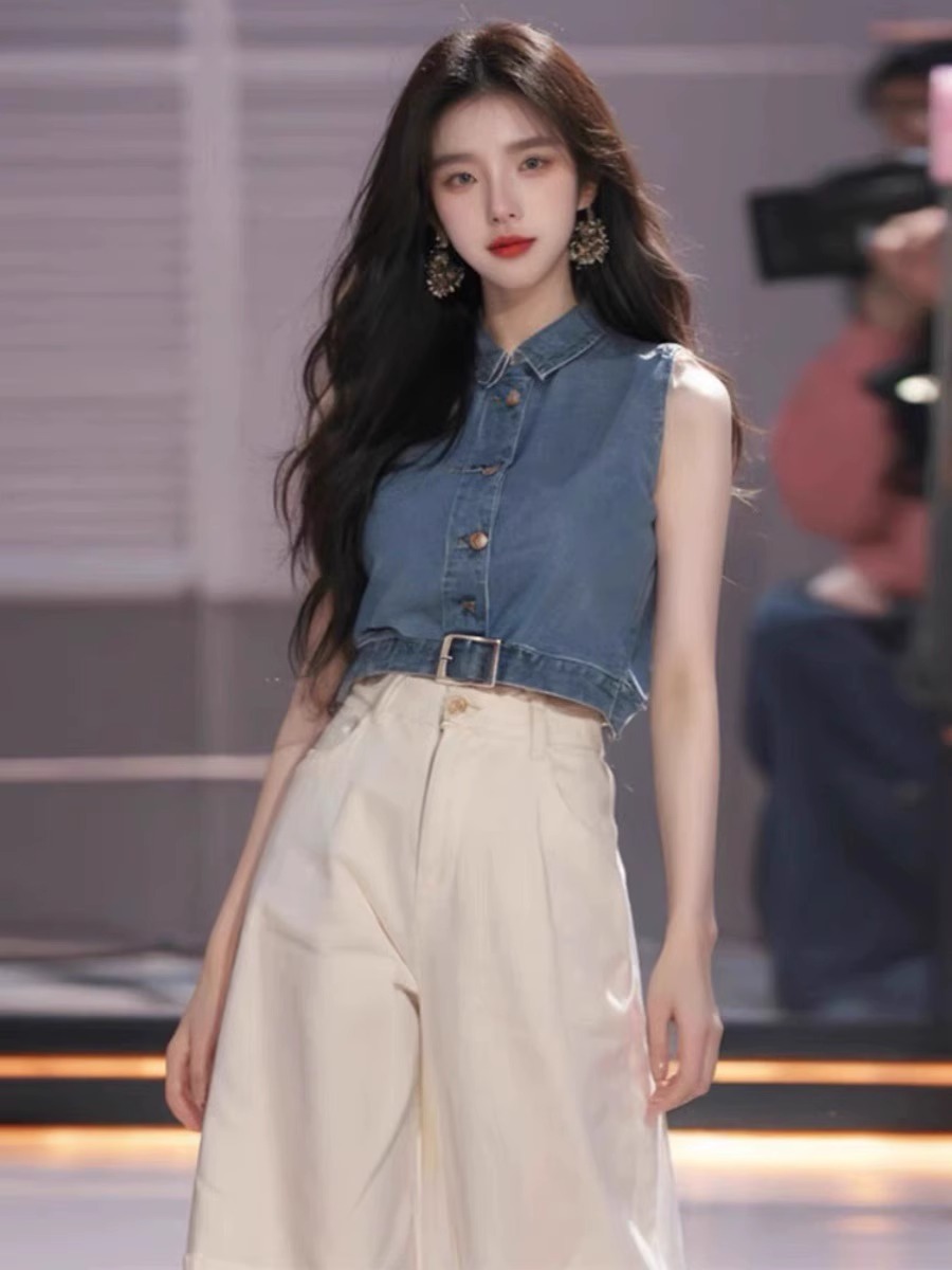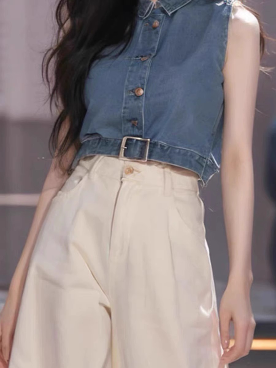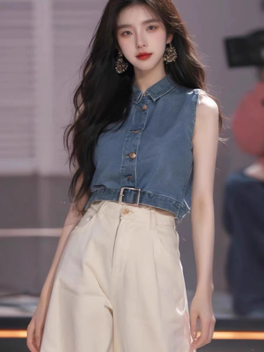 美式复古牛仔衬衫女新款爆款夏季减龄高级设计感无袖翻领上衣