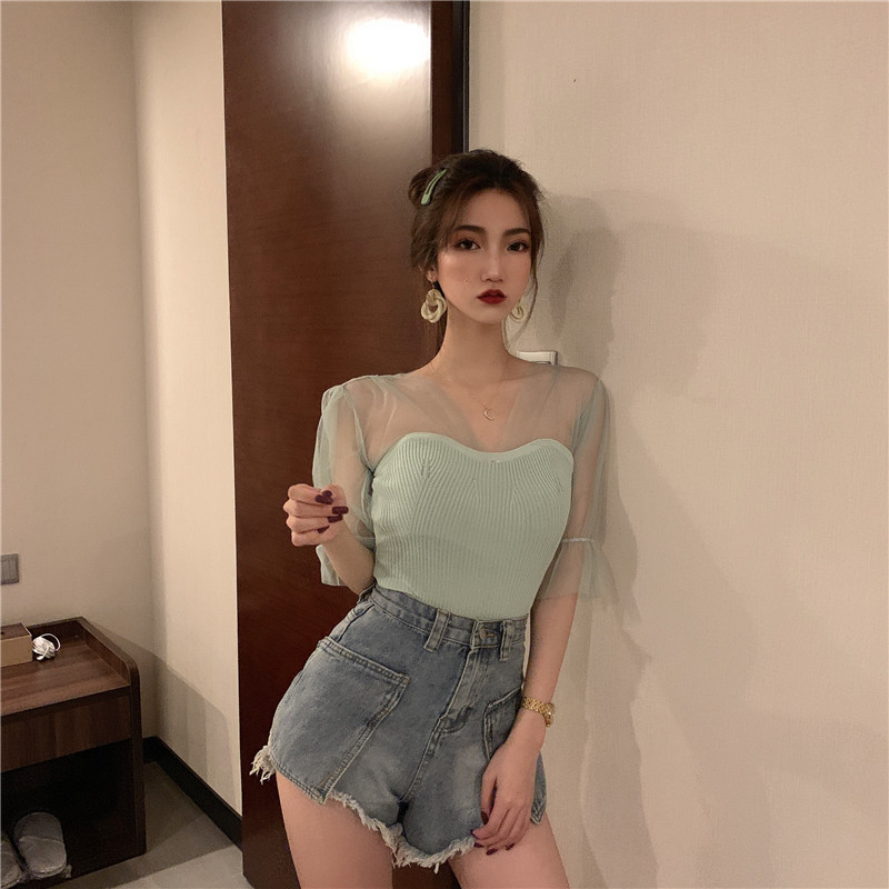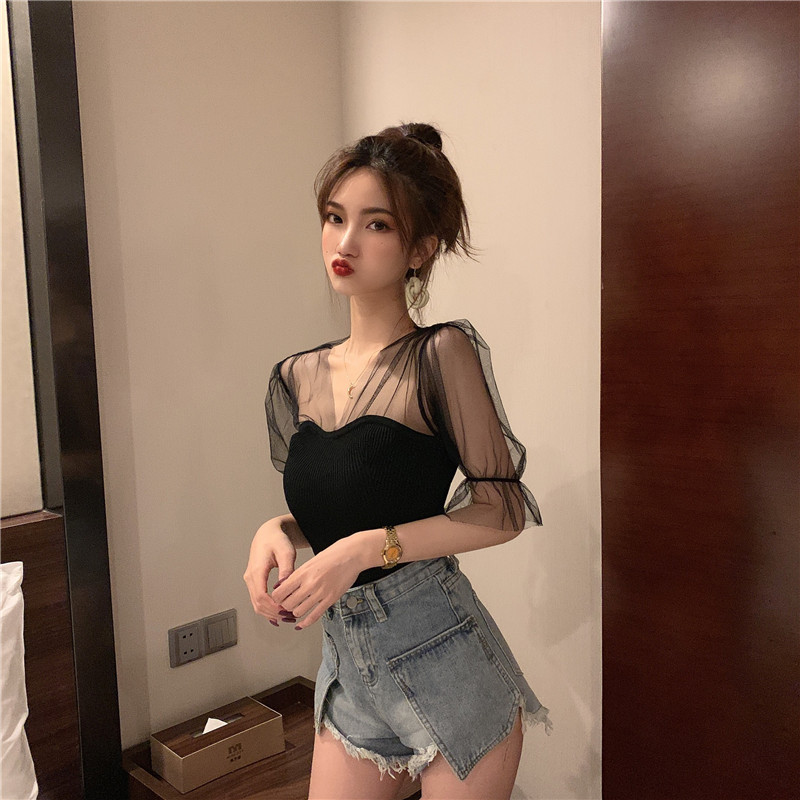 纯欲系女装高级设计感小众网纱蕾丝小衫女高档洋气泡泡袖上衣女夏